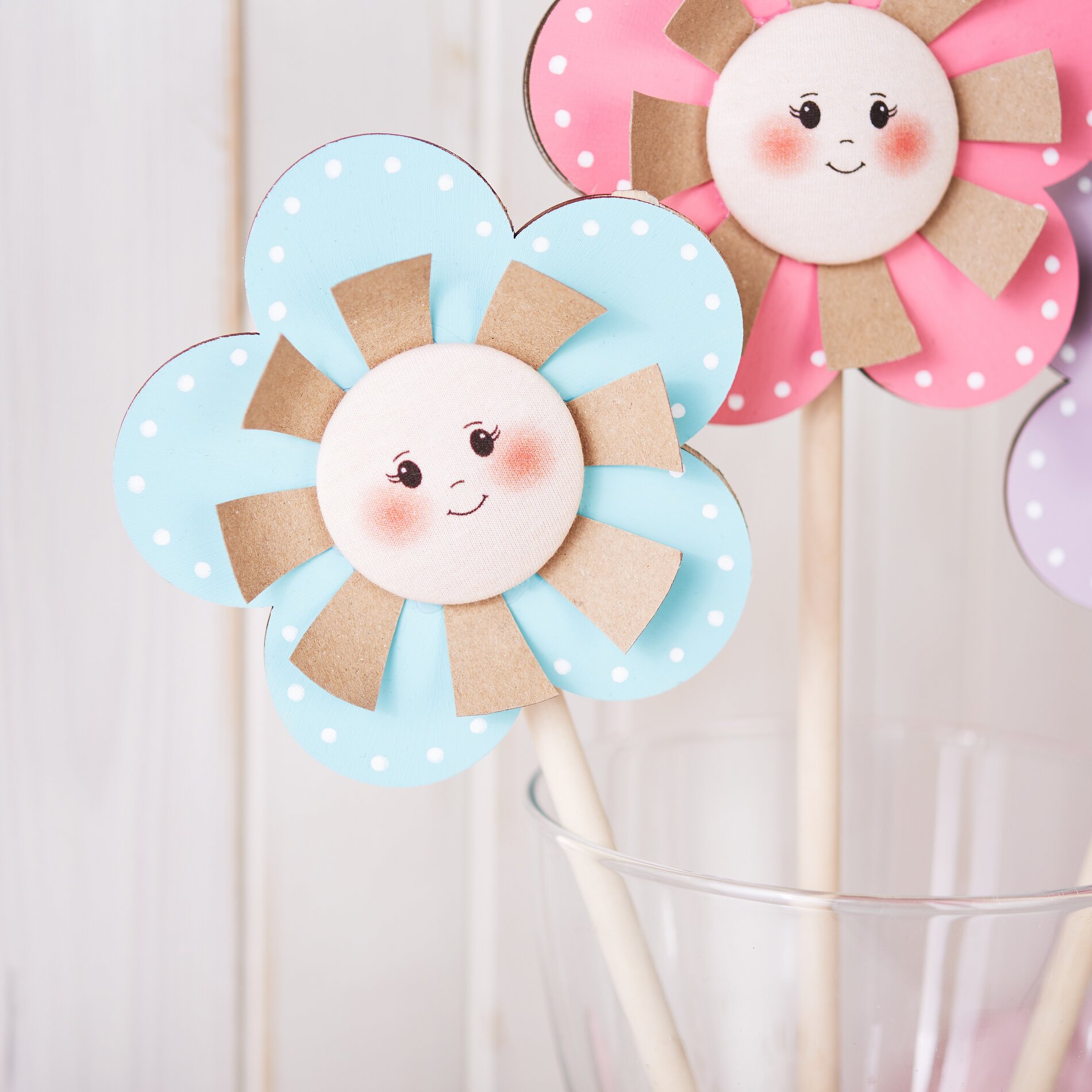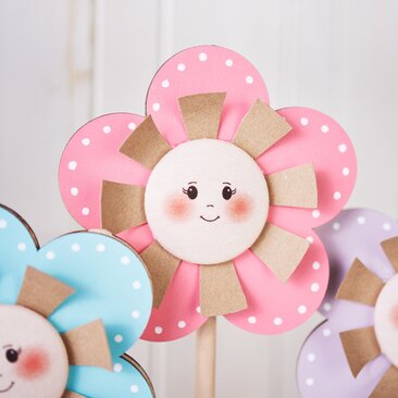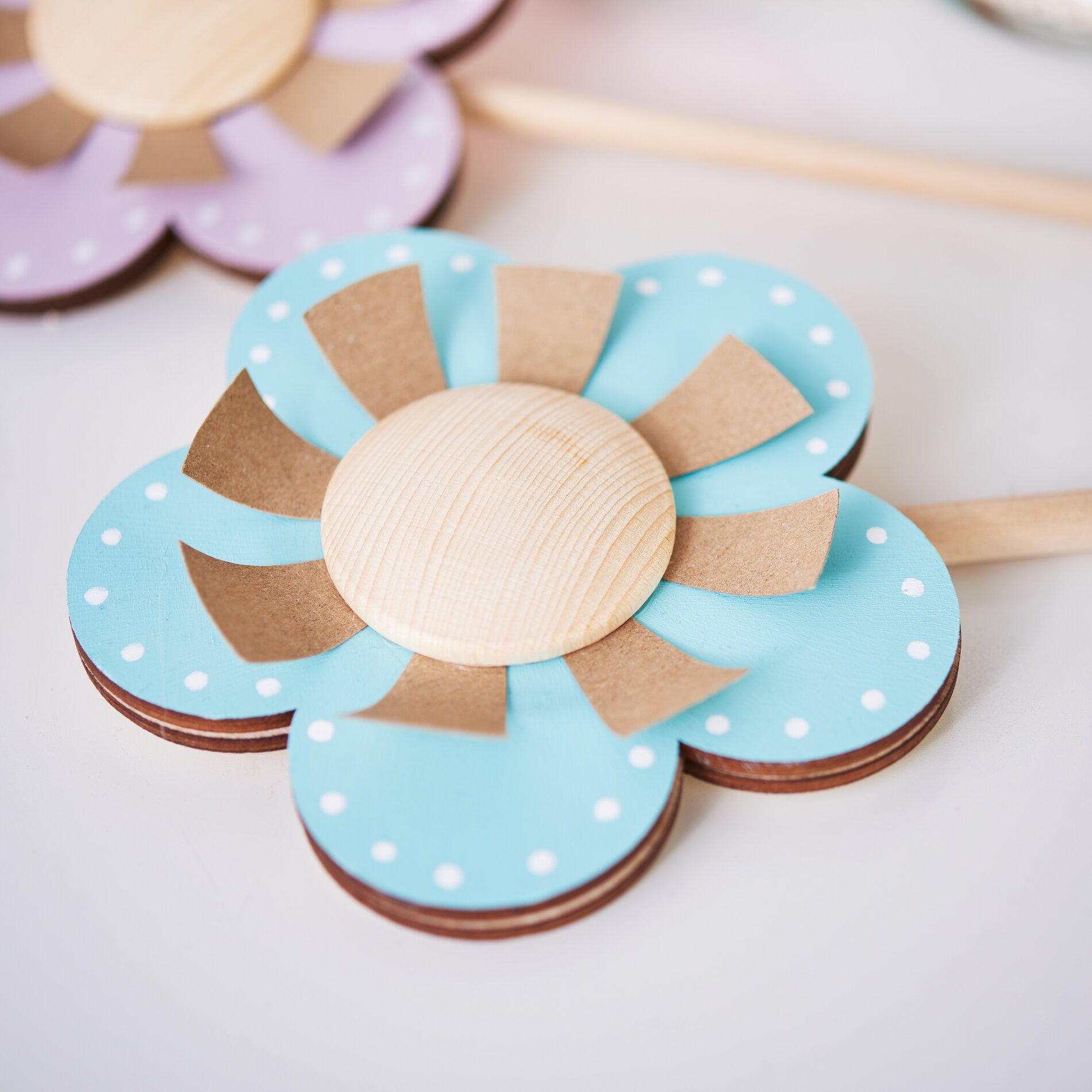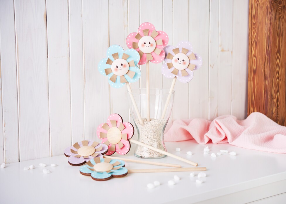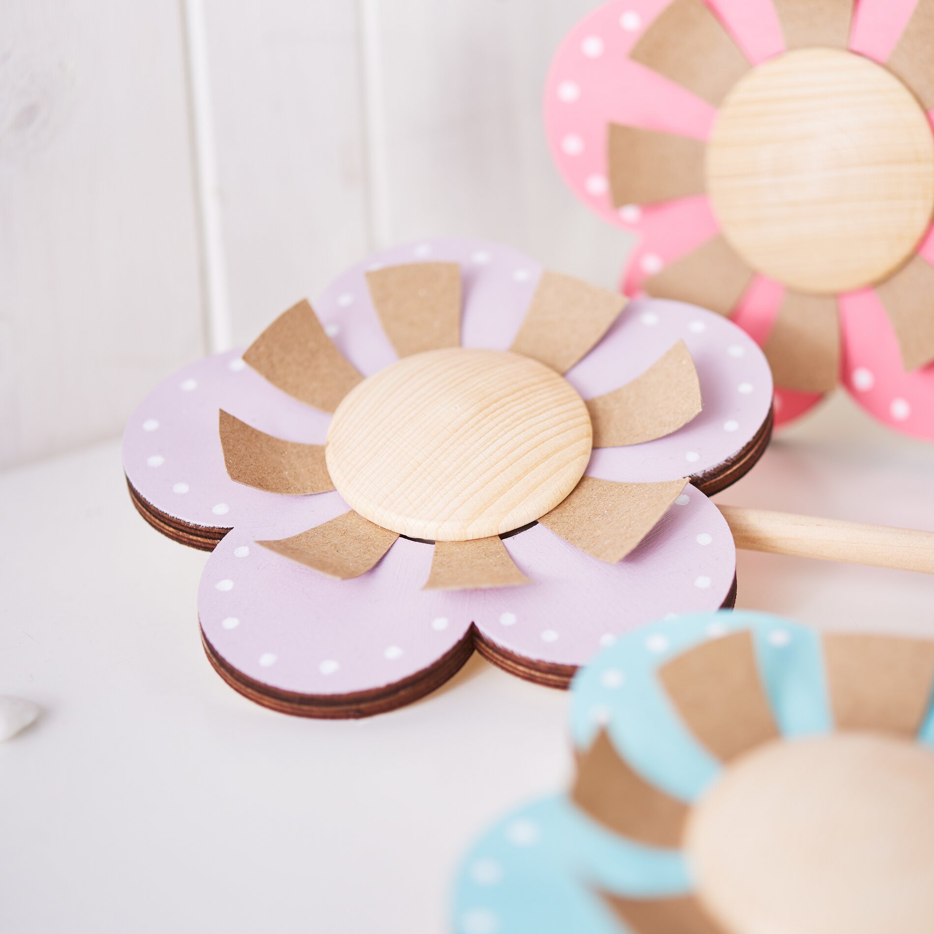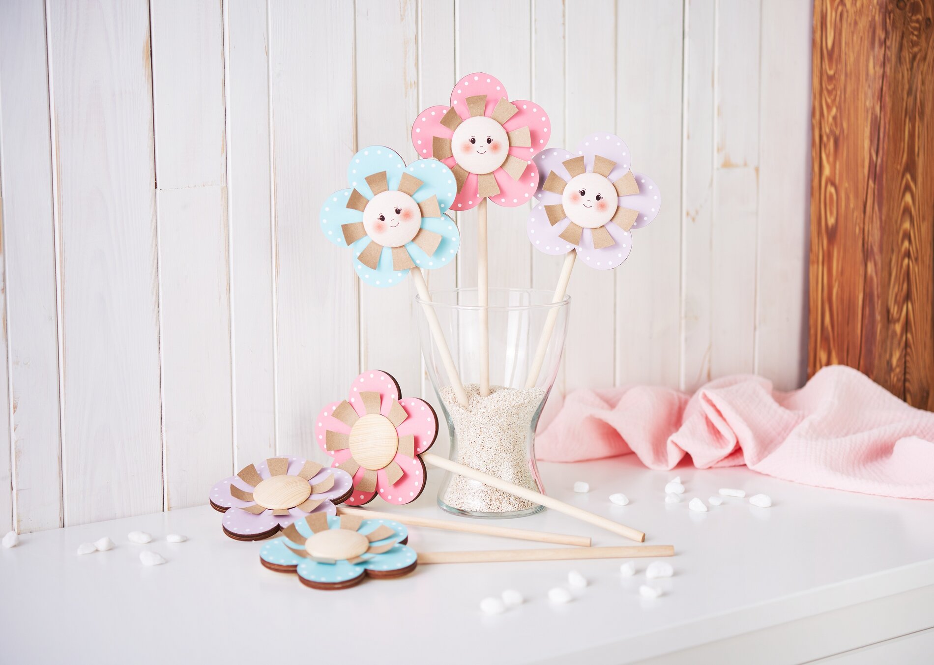 Teraz przyklej przygotowane kwiaty z papieru pakowego z drewnianymi deseczkami na środku pomalowanych kwiatów. Upewnij się, że wszystko jest na swoim miejscu, aby zapobiec ich przemieszczaniu się.