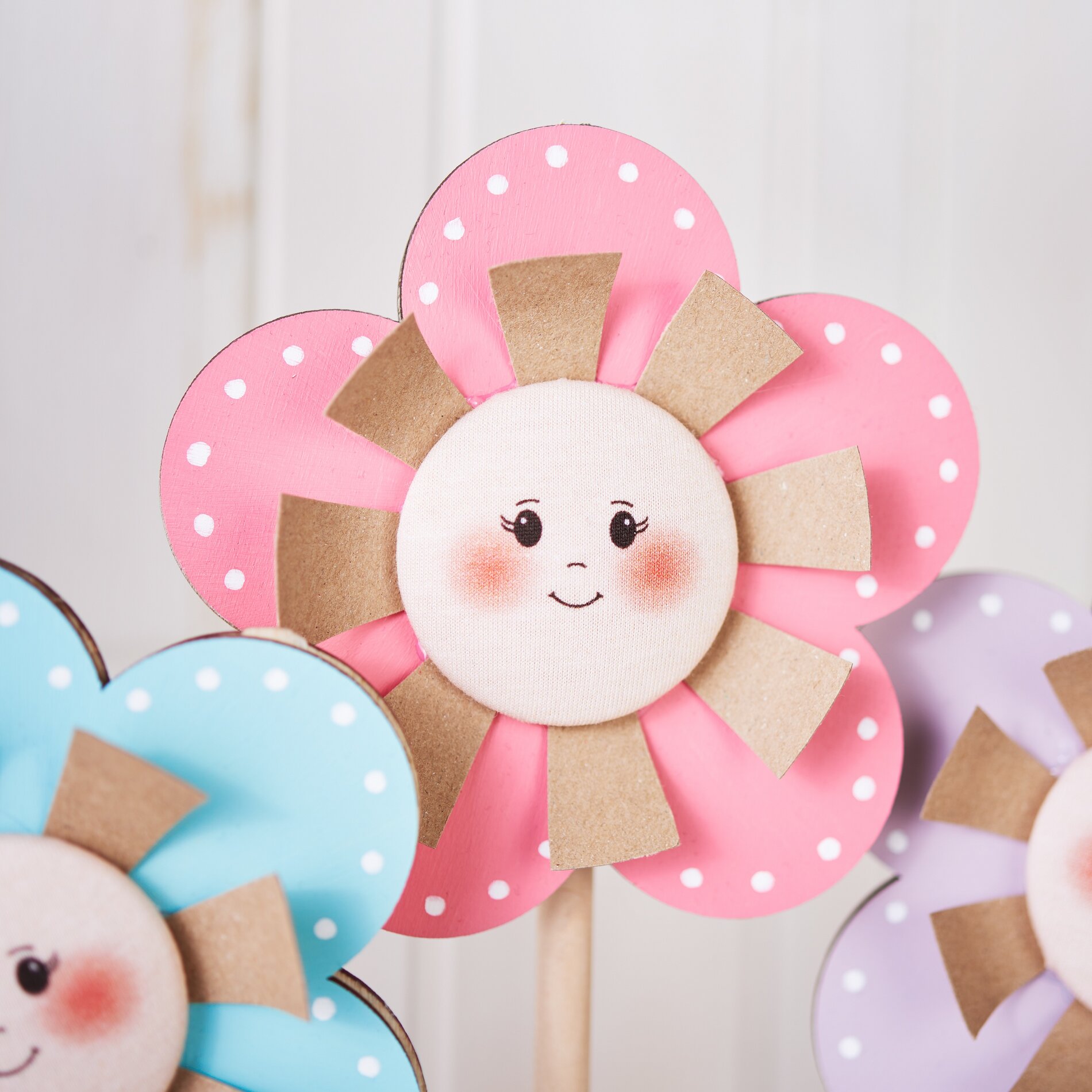 Przykryj pozostałe trzy drewniane płyty tkaniną dżersejową. Przytnij tkaninę do odpowiedniego rozmiaru i przeszyj wokół niej ściegiem wstecznym blisko krawędzi: umieść płytkę w tkaninie i pociągnij tkaninę razem. Zawiąż nitkę i przyklej powstałe twarze do pozostałych kwiatów z papieru pakowego.