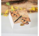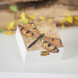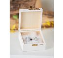 To urocze kwadratowe drewniane pudełko jest wykonane z drewna sosnowego. Ma długość ok. 10 cm, szerokość ok. 10 cm i wysokość ok. 4,8 cm. Wymiary wewnętrzne: 8,4 x 8,4 cm, wysokość 3 cm. Wysokość wieczka 1,3 cm.