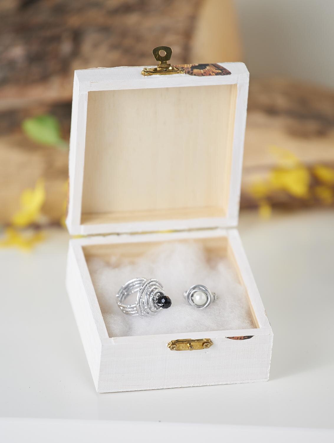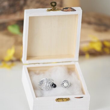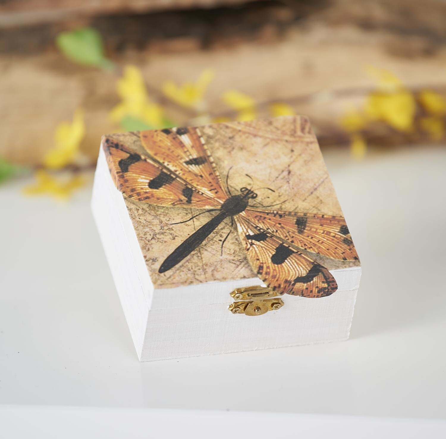 Przyklej kolejny motyw ważki na kawałku folii metalowej lub białego papieru i dokładnie wytnij ważkę. Można je przymocować do pierwszej warstwy pudełka za pomocą kleju 3D lub zwykłego kleju. Skrzydła drugiej ważki są stabilne i można nadać im odpowiedni kształt.