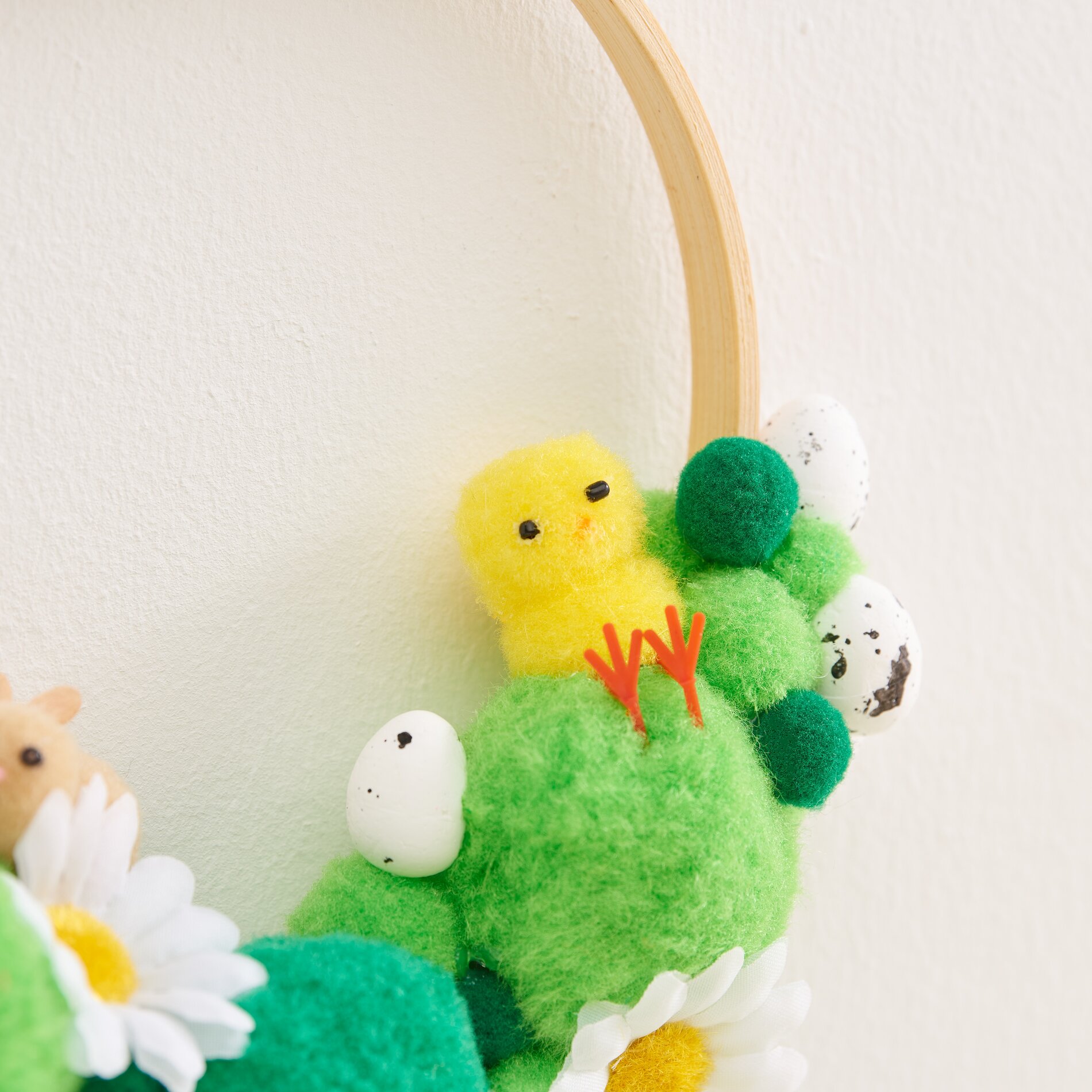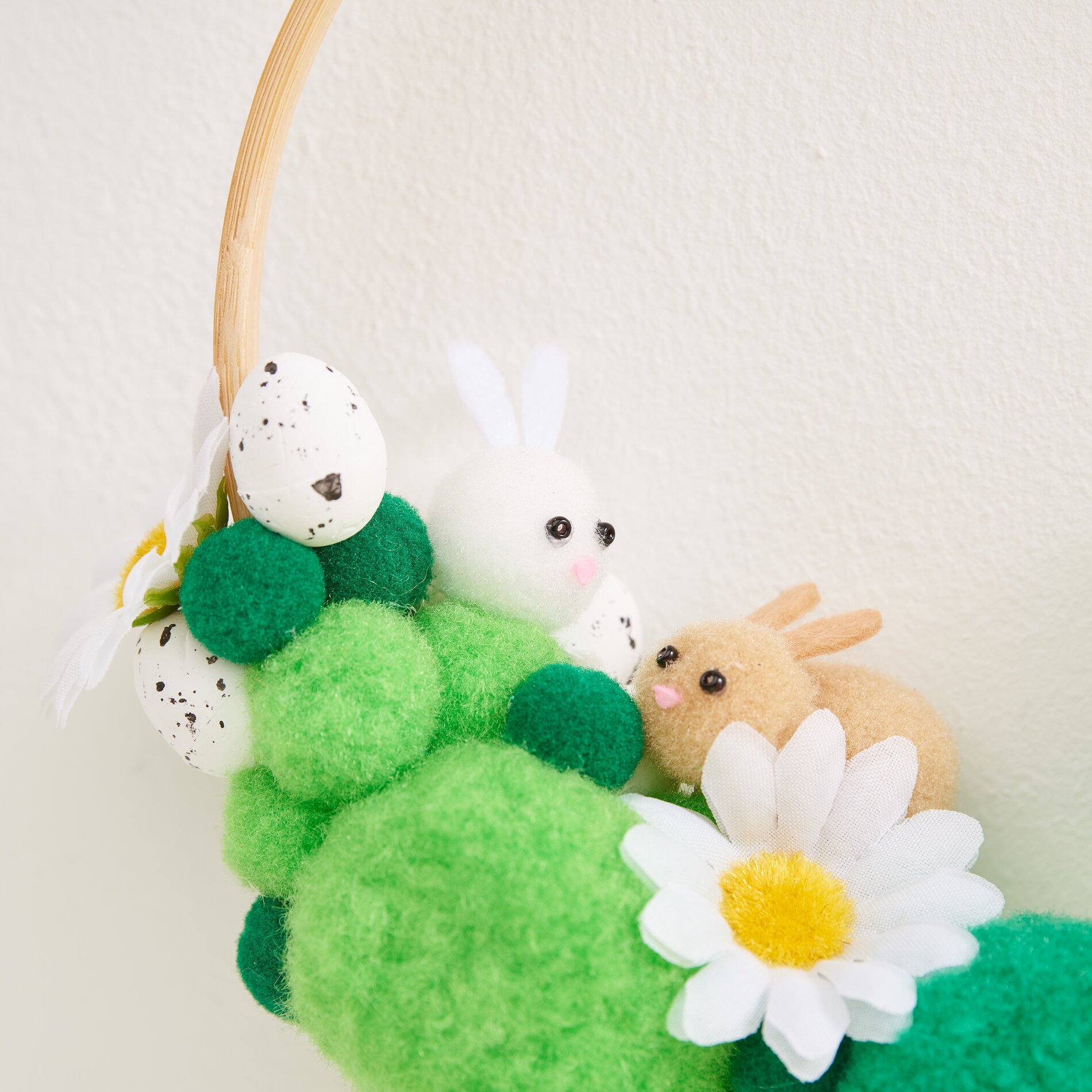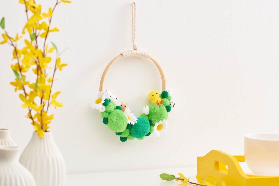 Po wyschnięciu kleju możesz zacząć dekorować i ozdabiać pierścień. Możesz dodać jajka, kwiaty i szenilowe kurczaki i króliczki za pomocą odrobiny gorącego kleju. I gotowe!