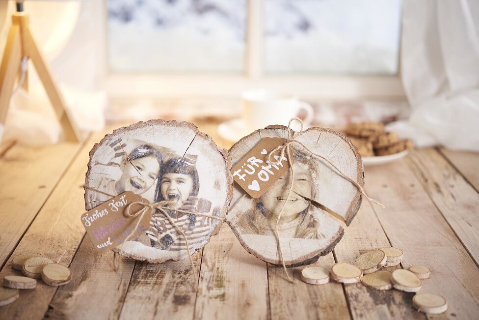 Wskazówka: Możesz oczywiście również stworzyć małe dyski z kory i dodać do nich małe zdjęcia. Następnie wywierć w nich mały otwór i przymocuj ładną wstążkę - a otrzymasz piękne spersonalizowane zawieszki na prezenty świąteczne lub urodzinowe.