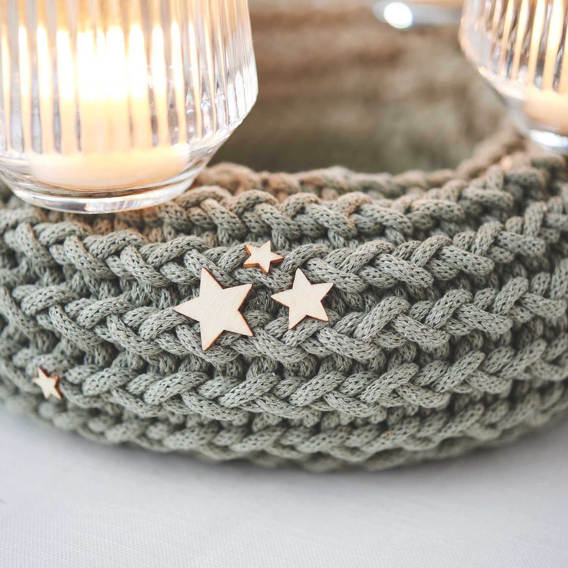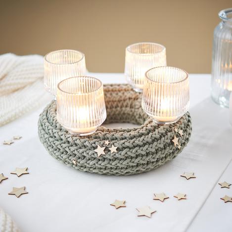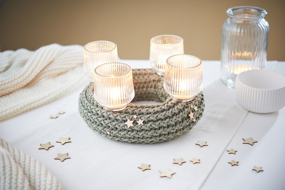 Kontynuować przerabianie Przerabiać kolejny rząd jak poprzednio, zawsze w schemacie "cyfra 8" i zamykać oczka na prawo. Kontynuuj ten proces, aż uzyskasz pożądaną długość (zalecamy ok. 74 cm na okładkę styropianowego pierścienia o średnicy 25 cm).