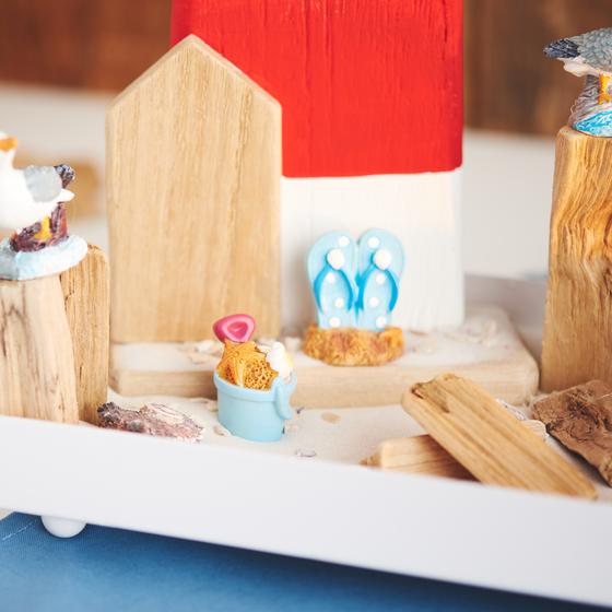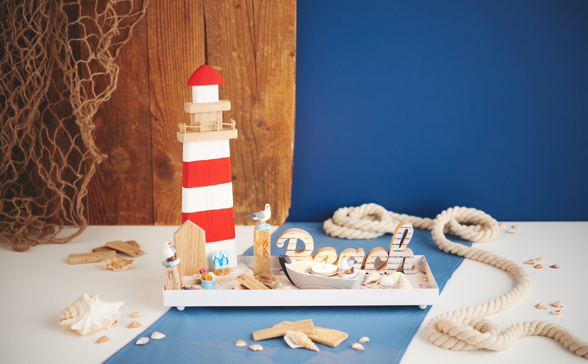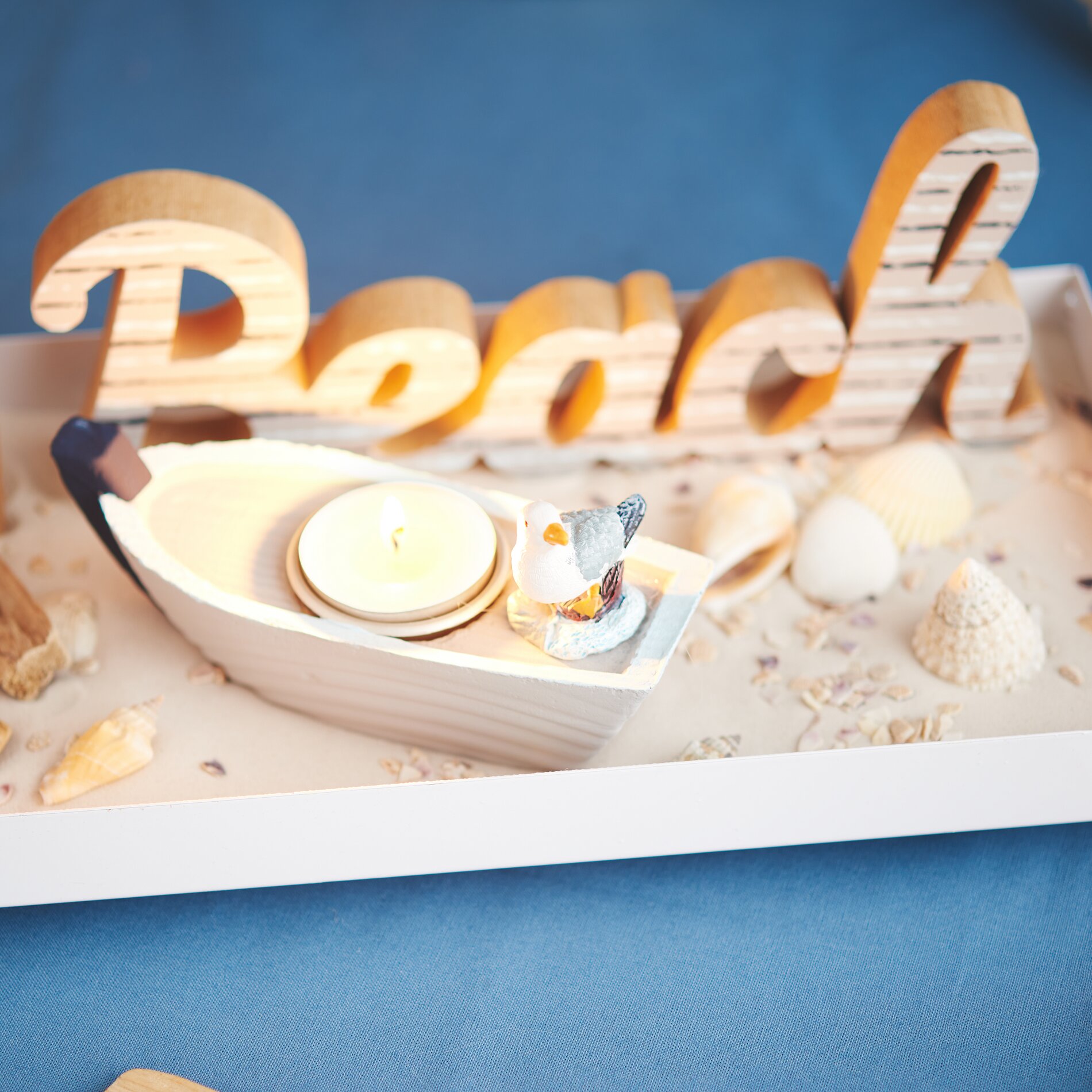 Place all the decorated elements on your tray. think about an arrangement that you like best. You can place the lighthouse and the tea light further forward or to the side so that everything stands out.