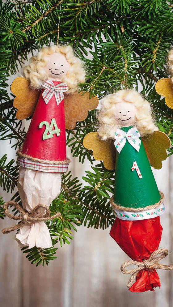 Then glue Straw silk paper into the opening with hot glue and decorate the robe with ribbon and Jute yarn, which is also attached with the tape-Ribbon . Glue the calendar numbers according to your wishes on the angel robes, use hot glue for this.