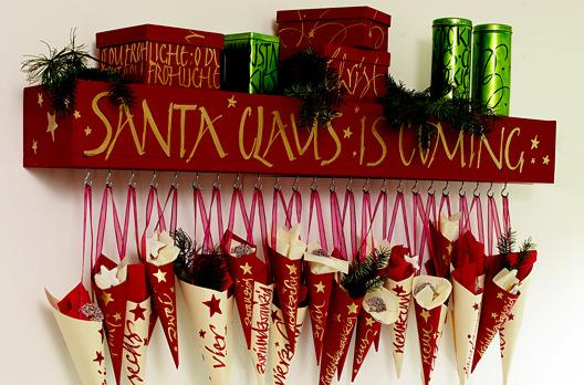 For example, a board with hooks or a pine garland to which the bags can be attached can be used as in the picture