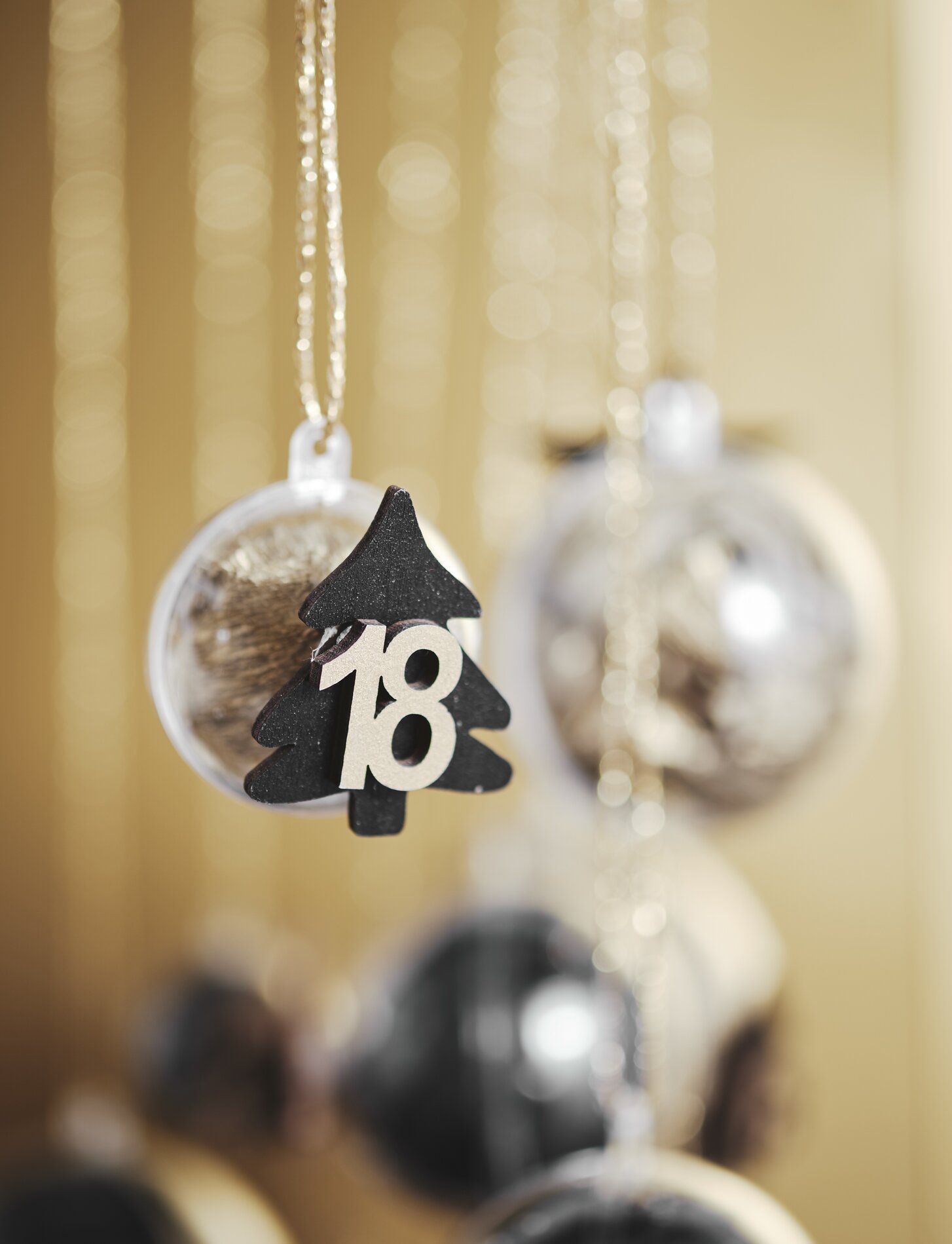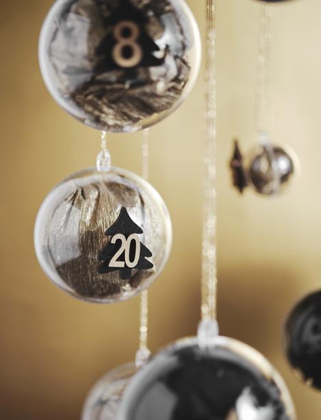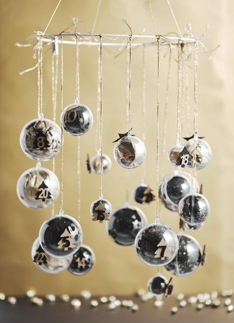 In this variant, fill the ball with small items as in the first example. Stick relief Advent numbers stickers either directly onto the sphere or onto stars that have been punched out in black beforehand. Then attach a decorative string to hang the balls.