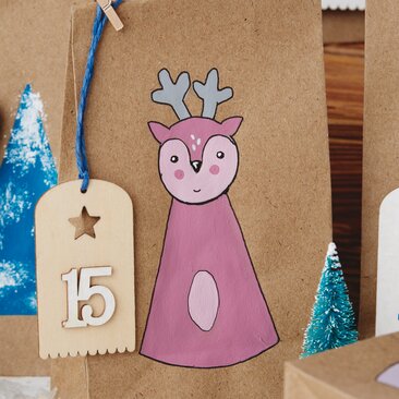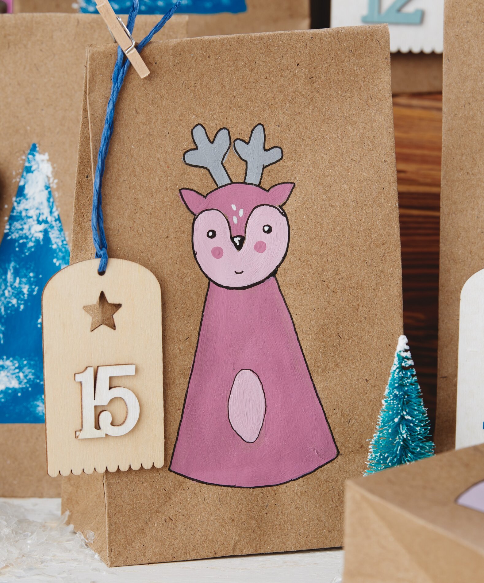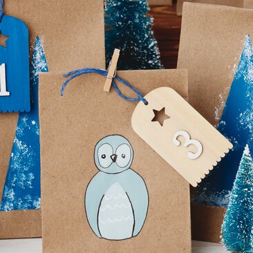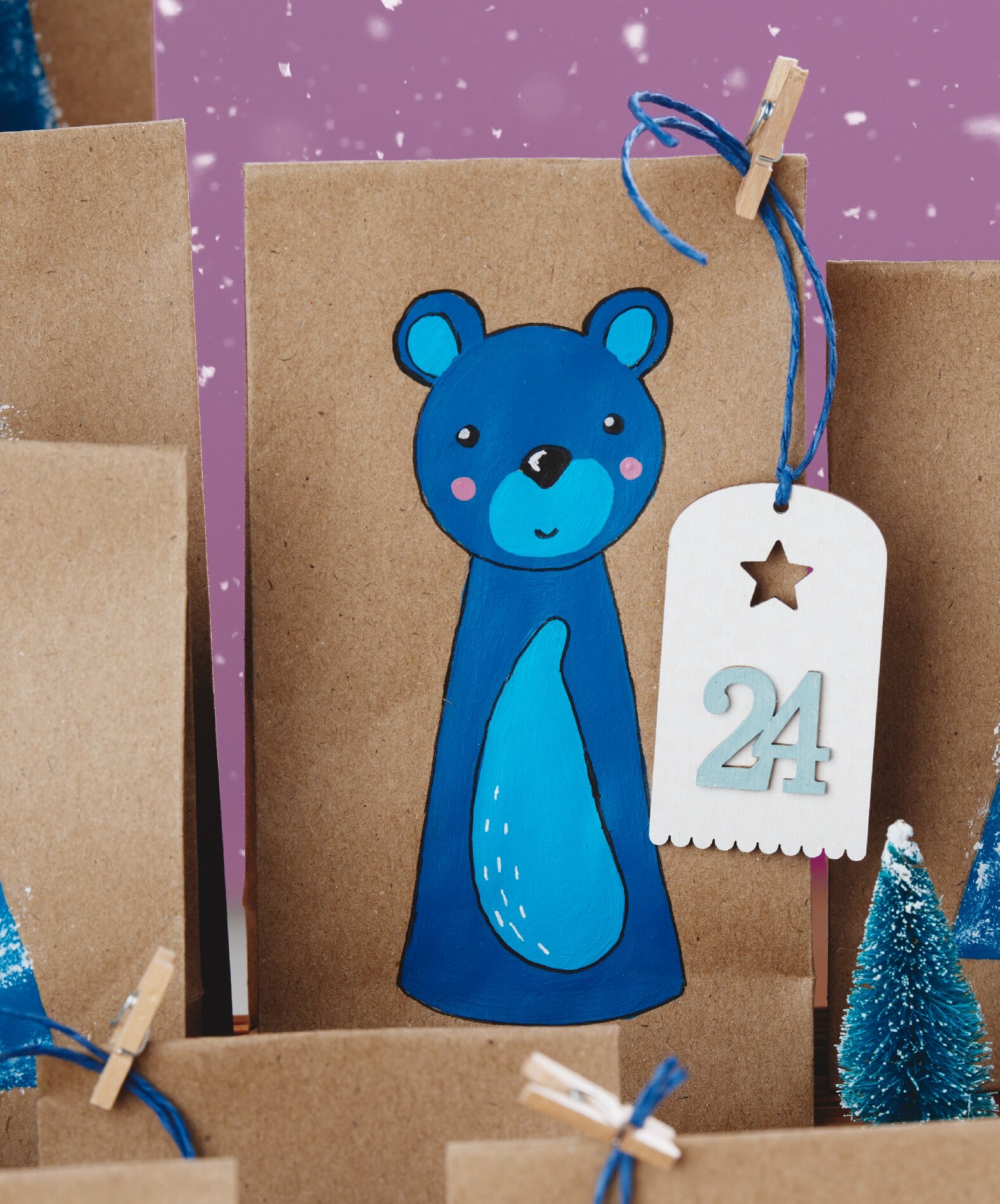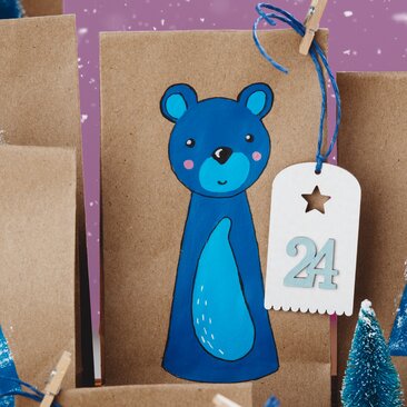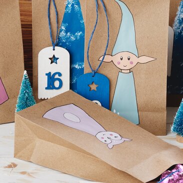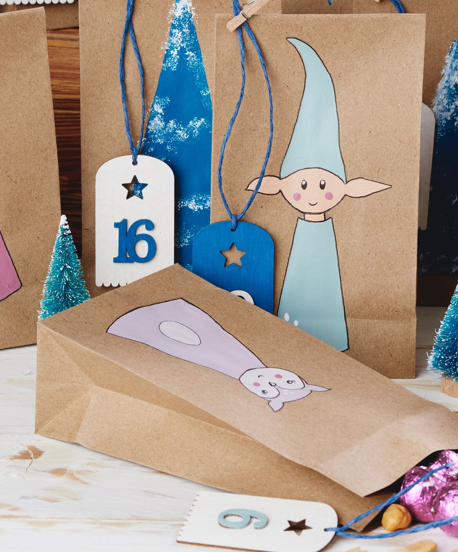Fill the bags with small gifts and treats. To close the bags, fold them over once at the top and secure them with a wooden clip. Attach the numbers to the clip.