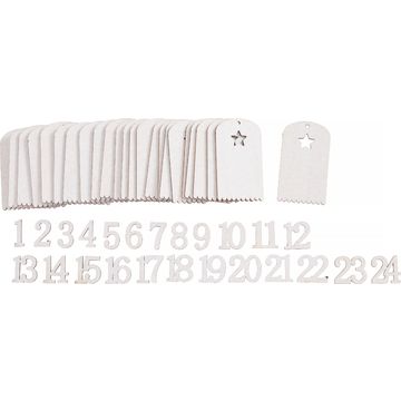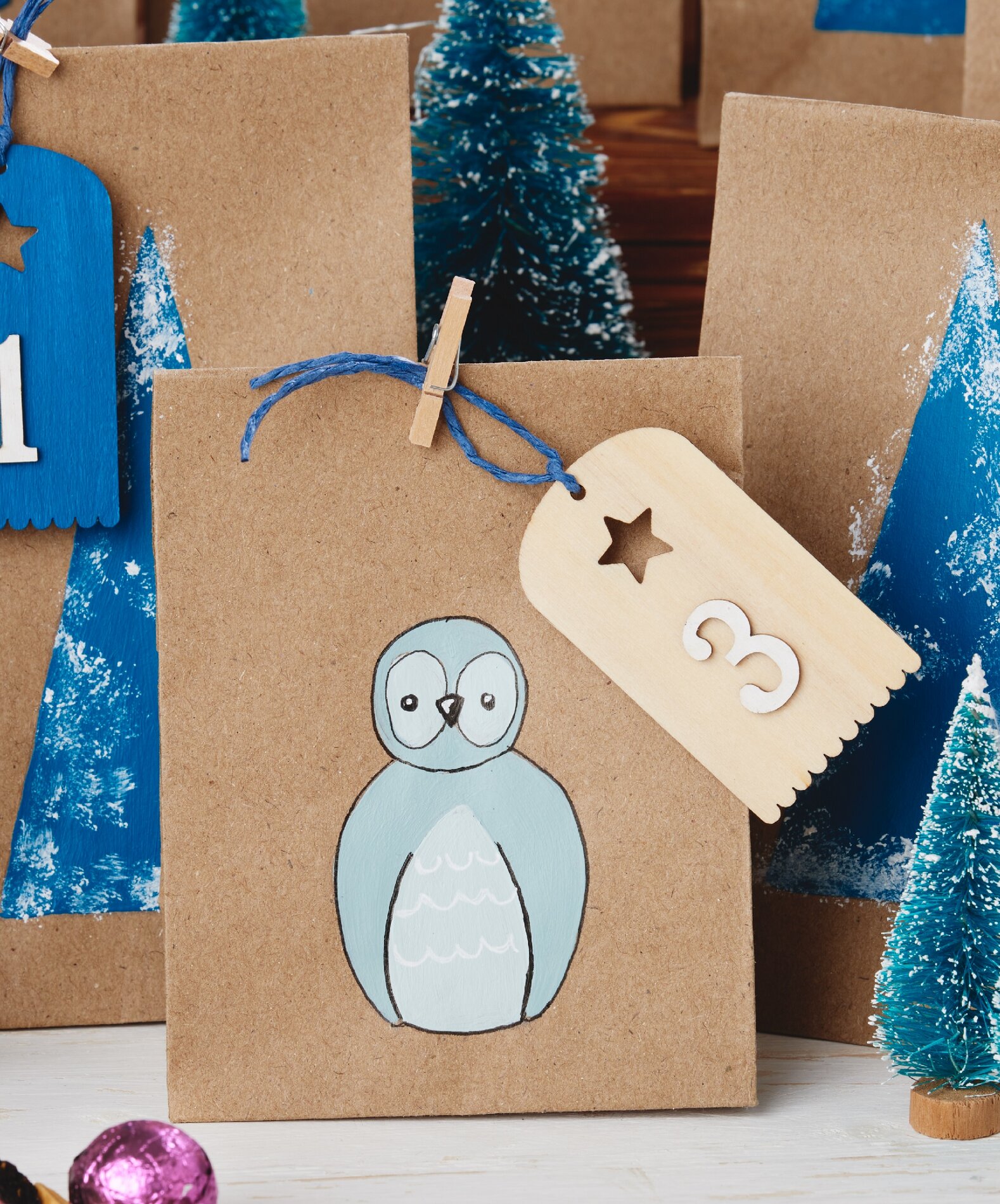 Create some advent calendar numbers with craft paint. Once dry, stick the numbers onto the tags and tie a piece of dark blue paper cord to each.