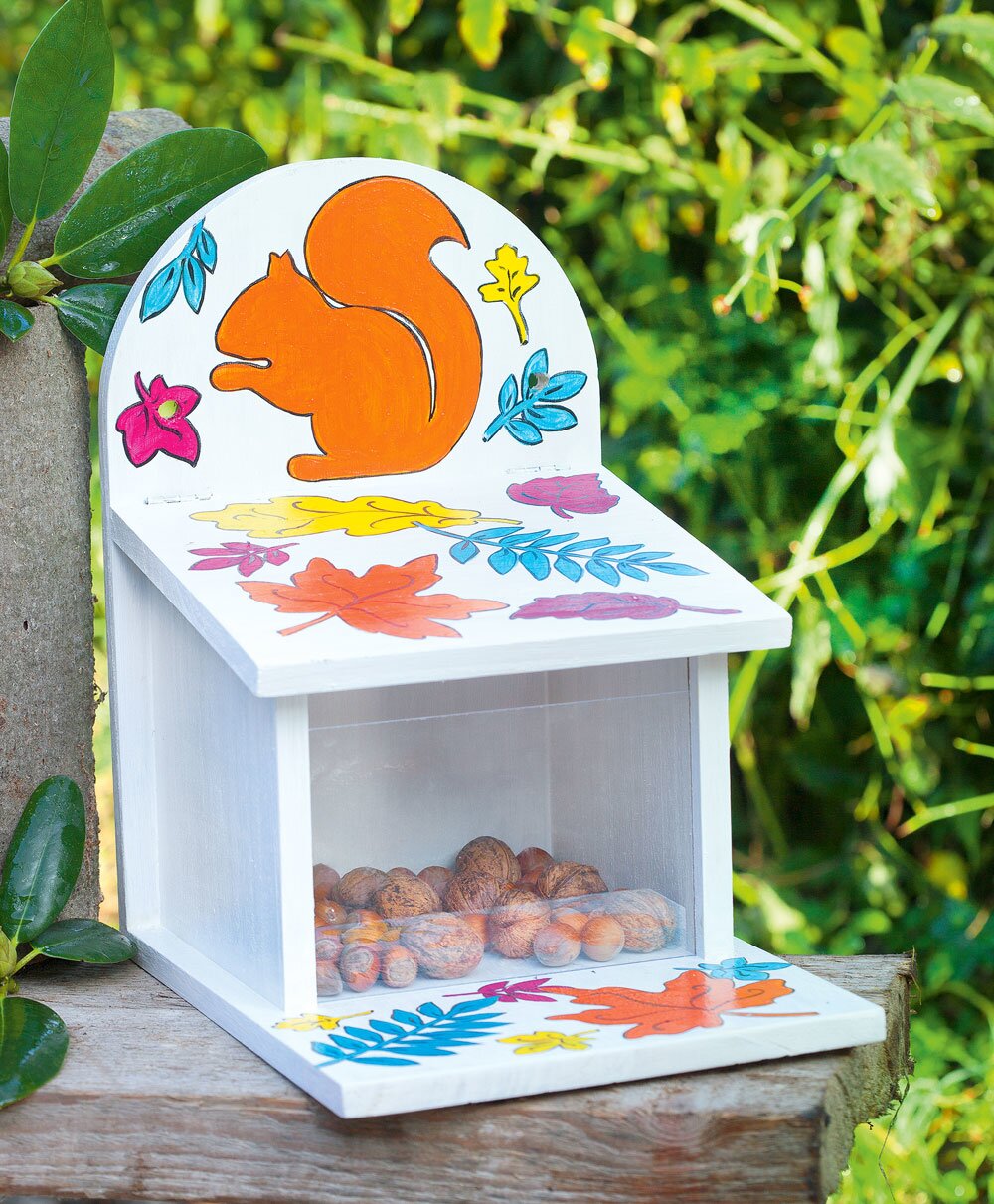 In order to make it easier for the squirrels to find food in the long, hard winter, there are feeding stations. These are small wooden houses from which the squirrels can easily get their food. In this manual we show you how you can customize Bird feeding house . Beautifully painted, the squirrels in your garden might also like it.