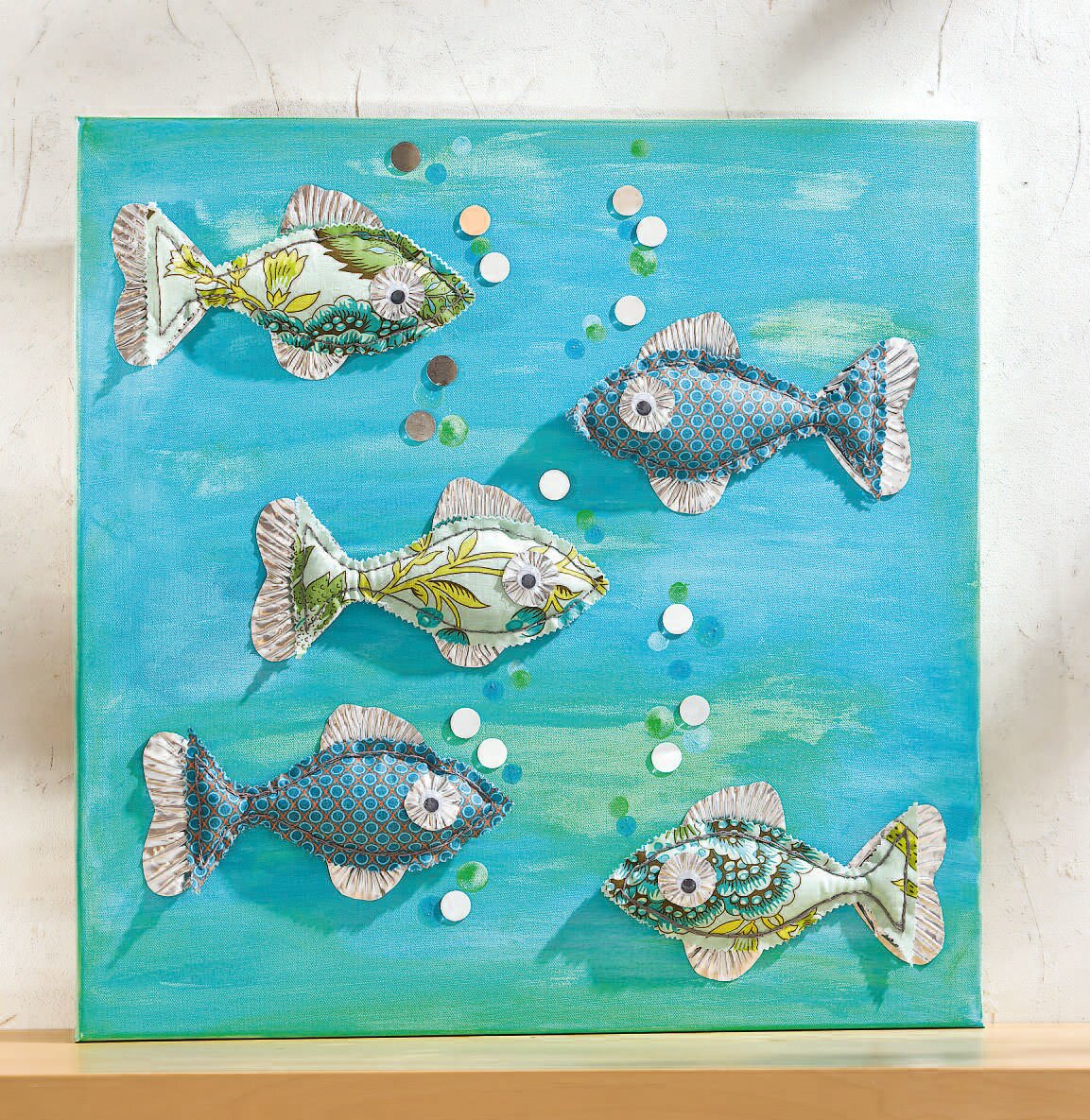 With hot glue first glue the fish on the fish, Stretched Canvas then fix the fins underneath and glue the eyes on the fish.
