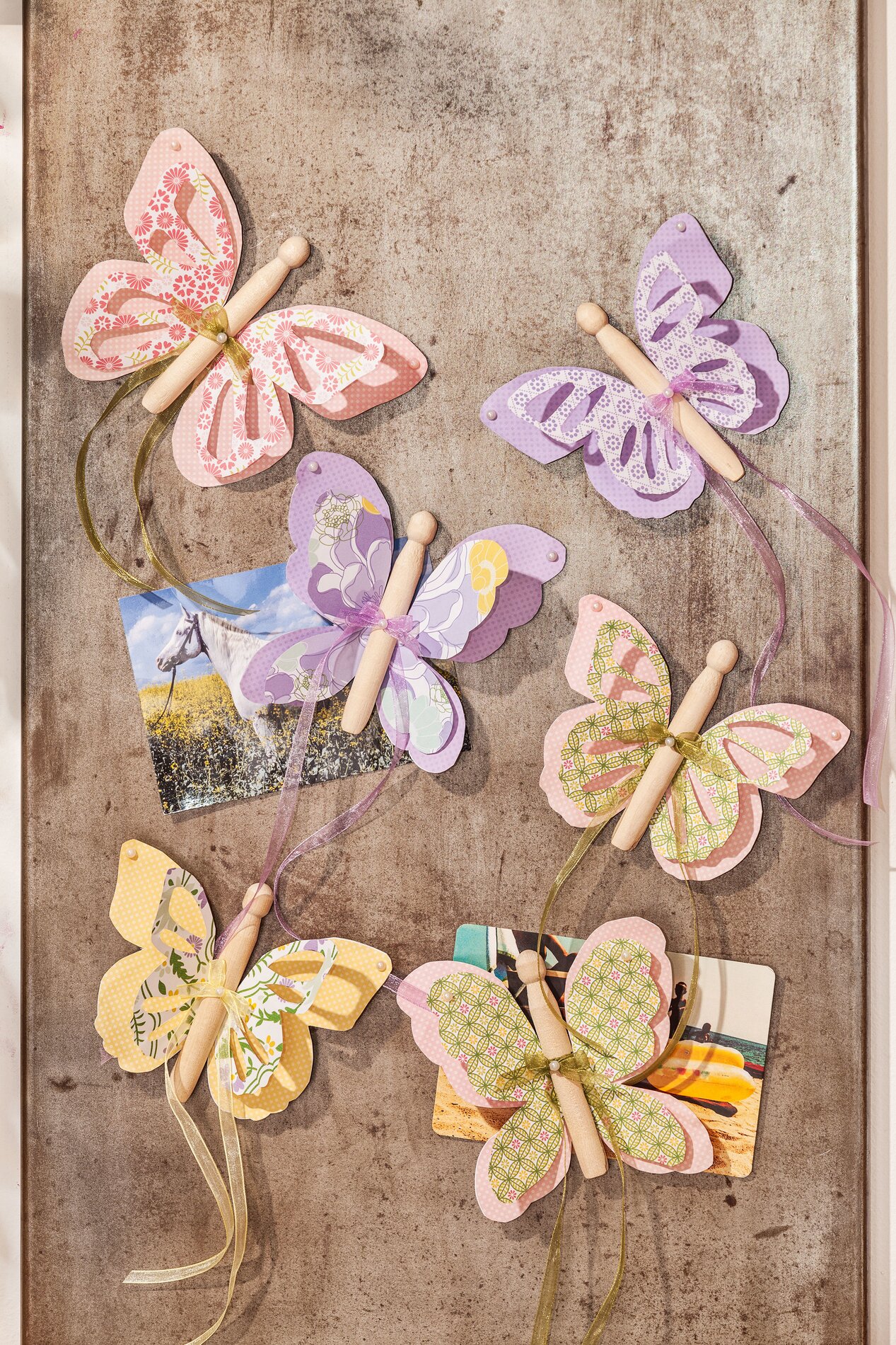 Take a clothespin for each butterfly and tie a delicate narrow organza bow in a matching colour around the clip. Fix the bow additionally with a small Pin.
