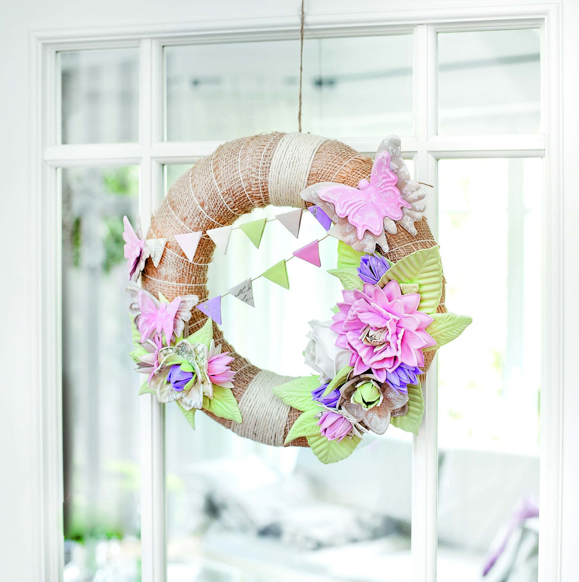 For the wreath, a Polystyrene ring, wide Jute ribbon, natural-coloured jute cord, Foam sheets in pastel shades and Thika's sponge rubber former are required. For the handicraft some Pins, some foam rubber glue, a hot glue gun, an iron and scissors should be available.