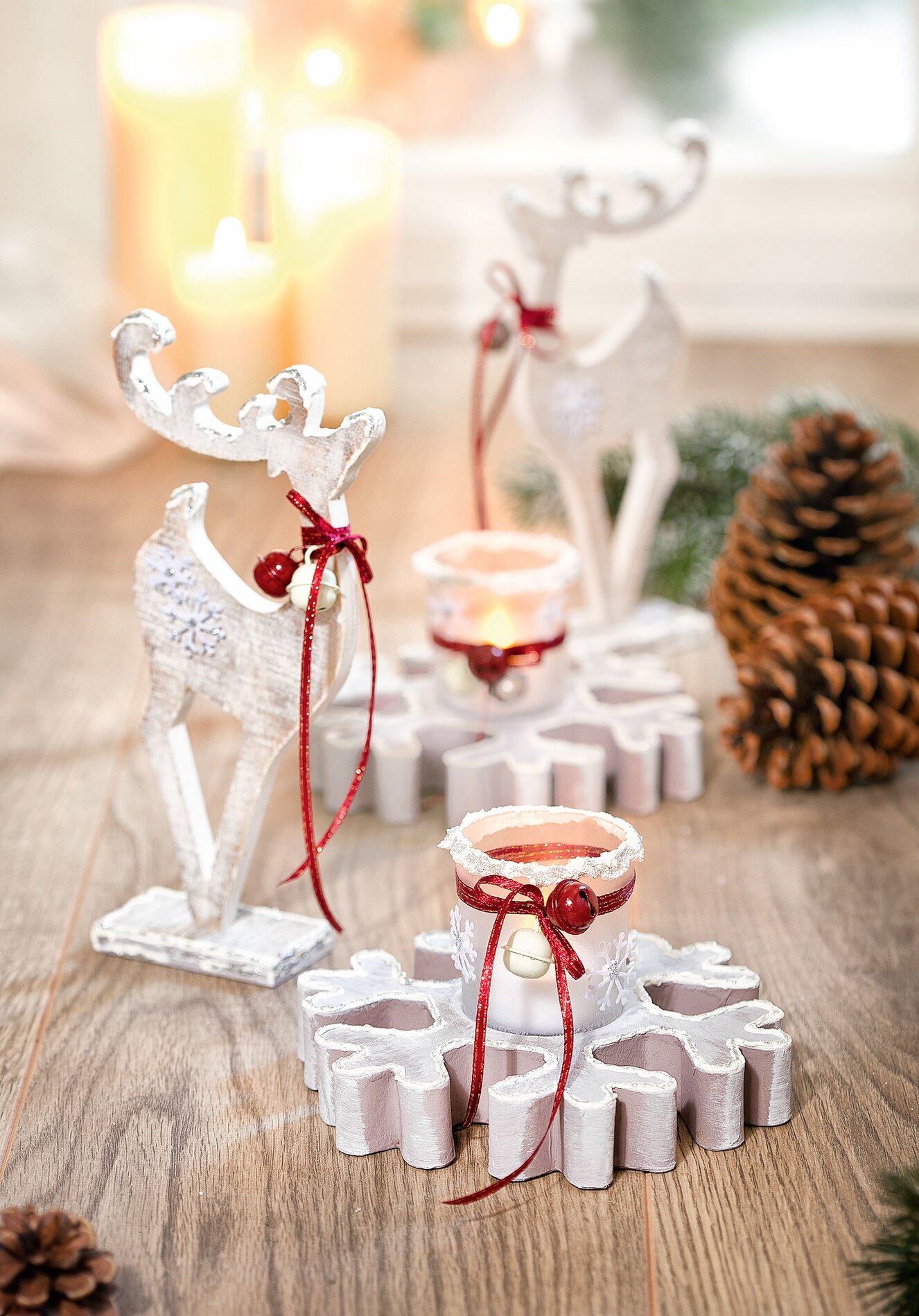 For this decoration idea you need besides the Tealight holders "snowflake" and the decorative standing figure "deer" you need a Glass for tea lights, chalky paint in white, a decorative snow liner, frost-effect paint, something narrow Satin ribbon and small red-white Jingles.