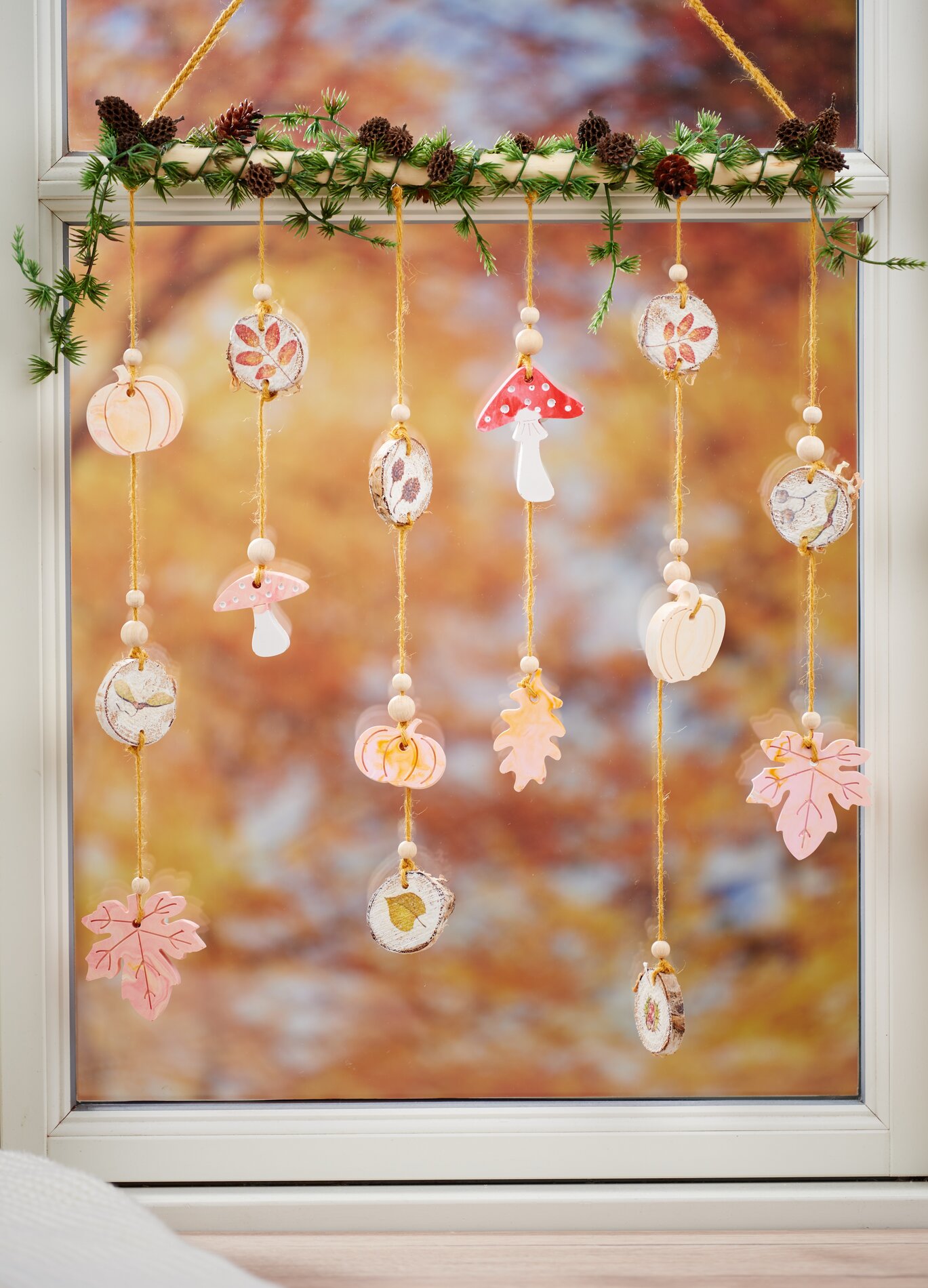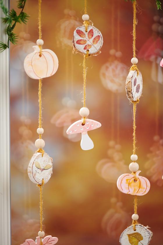 Finally, when you have threaded on the desired castings, you can hang them on the eyelets of the branch and a beautiful decorative idea for autumn is ready.