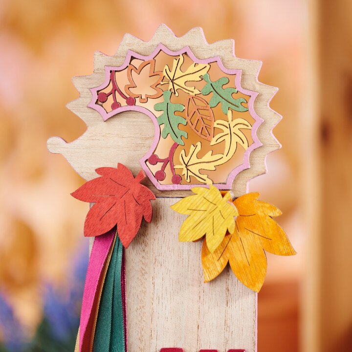 Paint the filigree decorations of the hedgehog, the edges of the stand and the wooden letters with warm autumn colors.