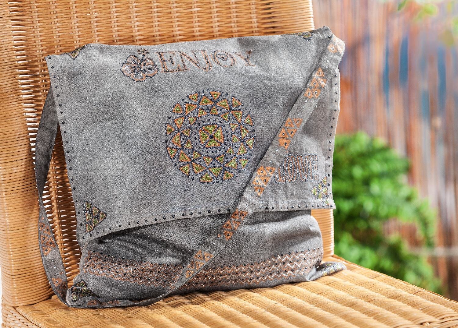 With grey textile spray paint the complete bag is first dyed grey. The odourless and lightfast Colour spray is sprayed directly from the bottle. The colour becomes wash-resistant by the later ironing or oven fixation.