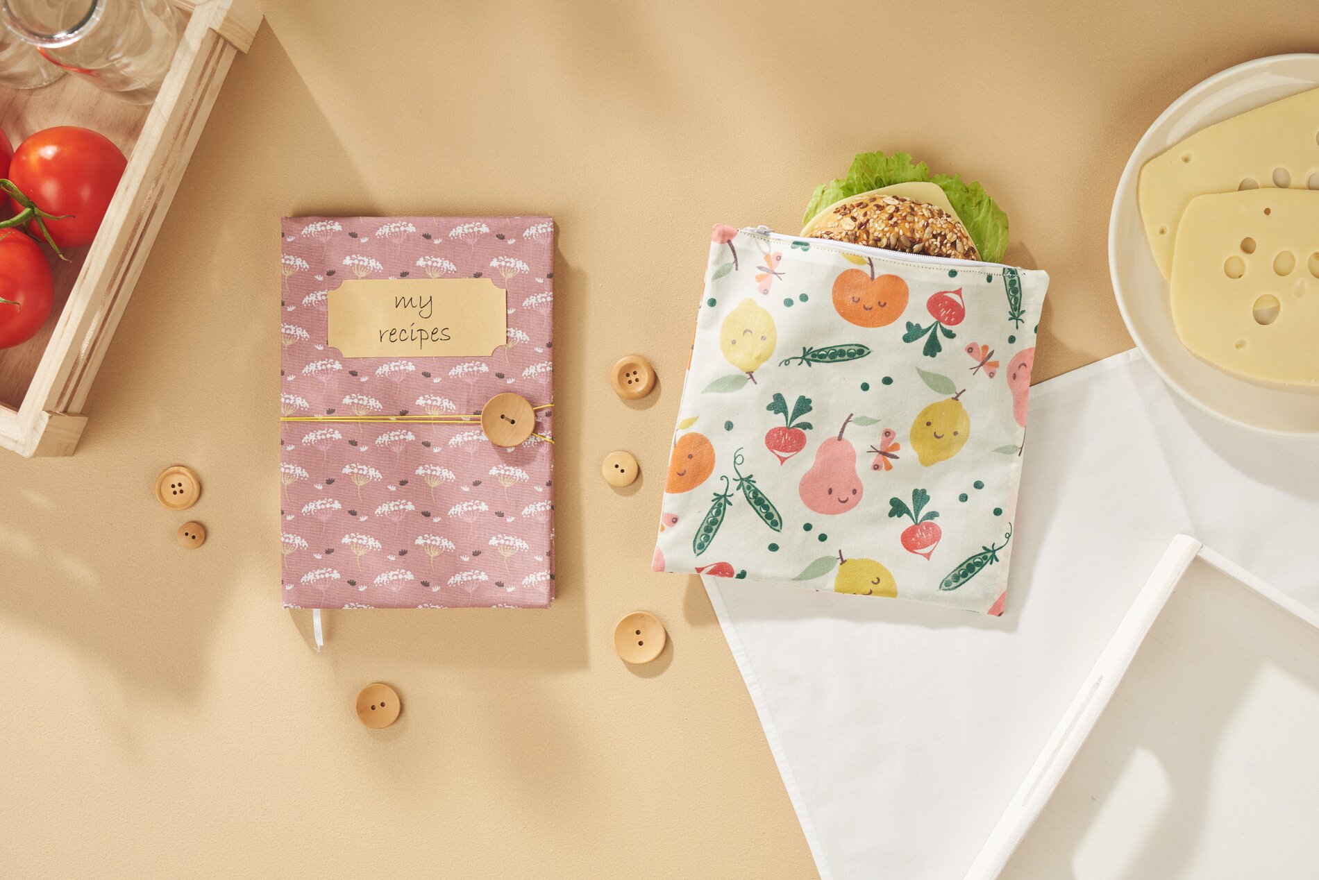 This idea is made with the produts ODIF OdiCoat and TexWax, which are import for DIY coating both. They can compared with each other here. The recipe book is treated with ODIF OdiCoat and TexWas was used for the snack bag.
