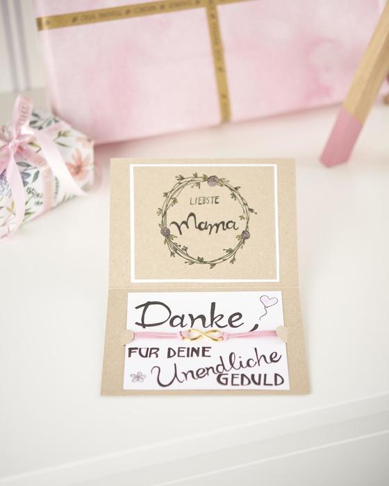 handlettering, in our example we have chosen "Thank you, for your infinite patience". Then glue the cut rectangle into the kraft paper card. Push the ends of the bracelet through the incisions of the card and fix Adhesive tape it with something on the backside
