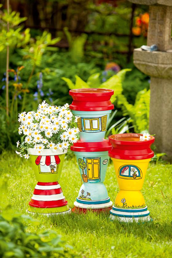 Paint the bell pots with stripes and design them as pedestals of the houses with flower meadows.