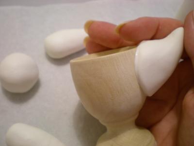 Mit dem starken Kleber Cléocol den Schwanz an den Eierbecher kleben. Kurz halten solange der Kleber trocknet und dann den Schwanz mehr in Form bringen.