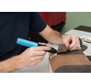 Preparations: Remove batteries from glue stick to charge. Place batteries in the charging cradle. The charging cradle is powered by a suitable USB connection. The batteries must be fully charged before use. Then reinsert the rechargeable batteries in the glue stick. Open the glue stick compartment and insert a glue stick. To switch on, press the on/off button until the illuminated ring starts to flash. If the ring lights up continuously, the glue stick is ready for use. The warm-up time is approx. 60 seconds. The gluing temperature is approx. 150 °C. The material to be glued must be clean, dry and free of grease.