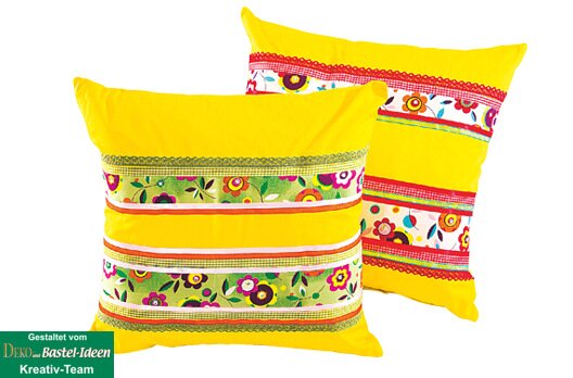 Stripes of different fabrics, ribbons and coloured lace are applied to the colourful cushions.