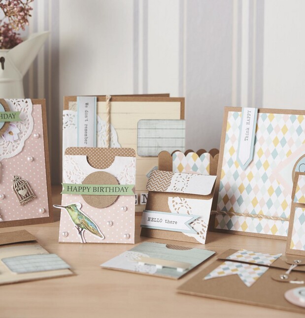 Arrange all the papers together with lace paper and other accessories on your card before sticking them on. Afterwards you glue the card: