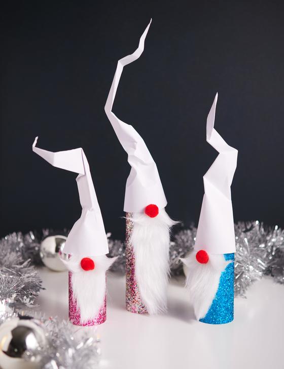Cardboard roll gnomes with a glitter look