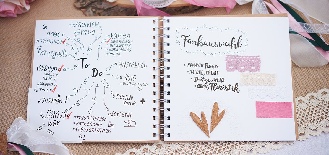 For a better organization, you can create a practical Weddingplanner. There you can choose the colours for the decoration, cuttings from bridal magazines, the checklist, the guest list and the schedule. This way you don't lose the overview even in stressful phases and still have a nice souvenir after the wedding!