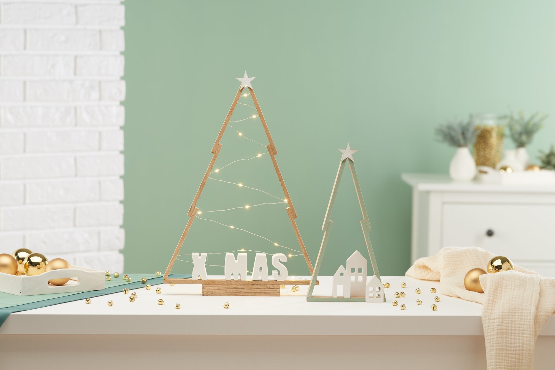 As soon as the trees are completely dry, they can be decorated as desired. A micro LED chain of light can be attached to the back of the large tree using hot glue. To do this, attach a magnet to the trunk to which the battery compartment of the chain of light is attached. It is not visible from the front and can be easily removed to change the battery.