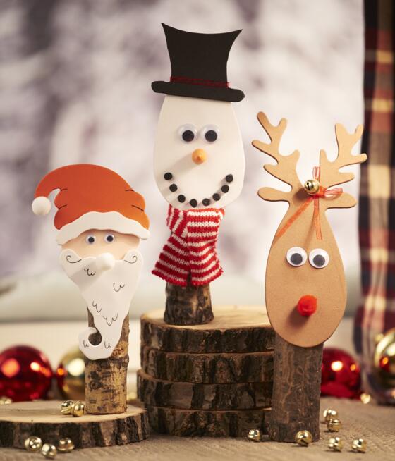 Now glue the already cut out faces with hot glue on the bark trunks. With Wobbly eyes you can make funny faces to the snowman, Santa Claus and the reindeer. As noses you can use little Pompoms or with the snowman a small styrofoam carrot. The mouth of the snowman was also made of small Pompoms ones
