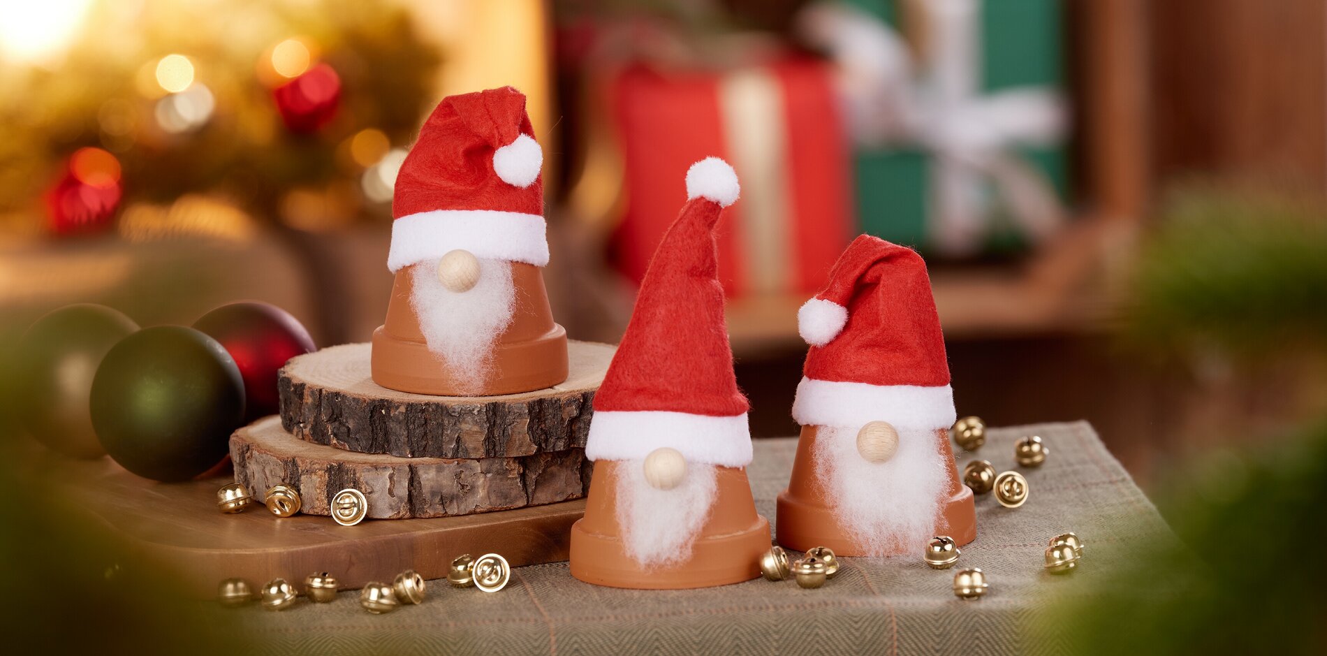 The small, simple clay pot gnomes are not only cute, but can also be made in a very short time. All you need are clay pots, Christmas hats, filler wool, wooden balls and some craft glue.