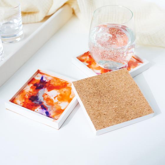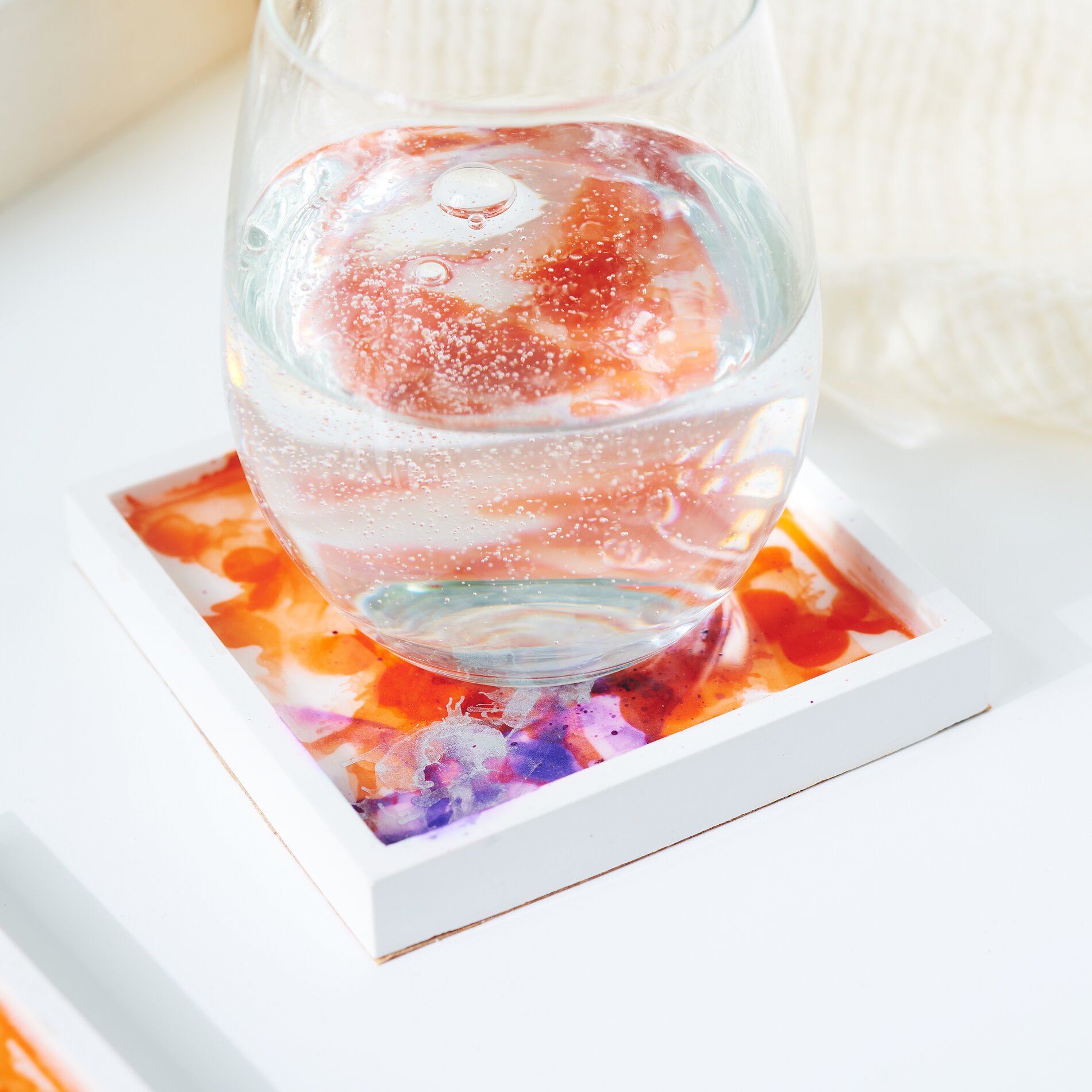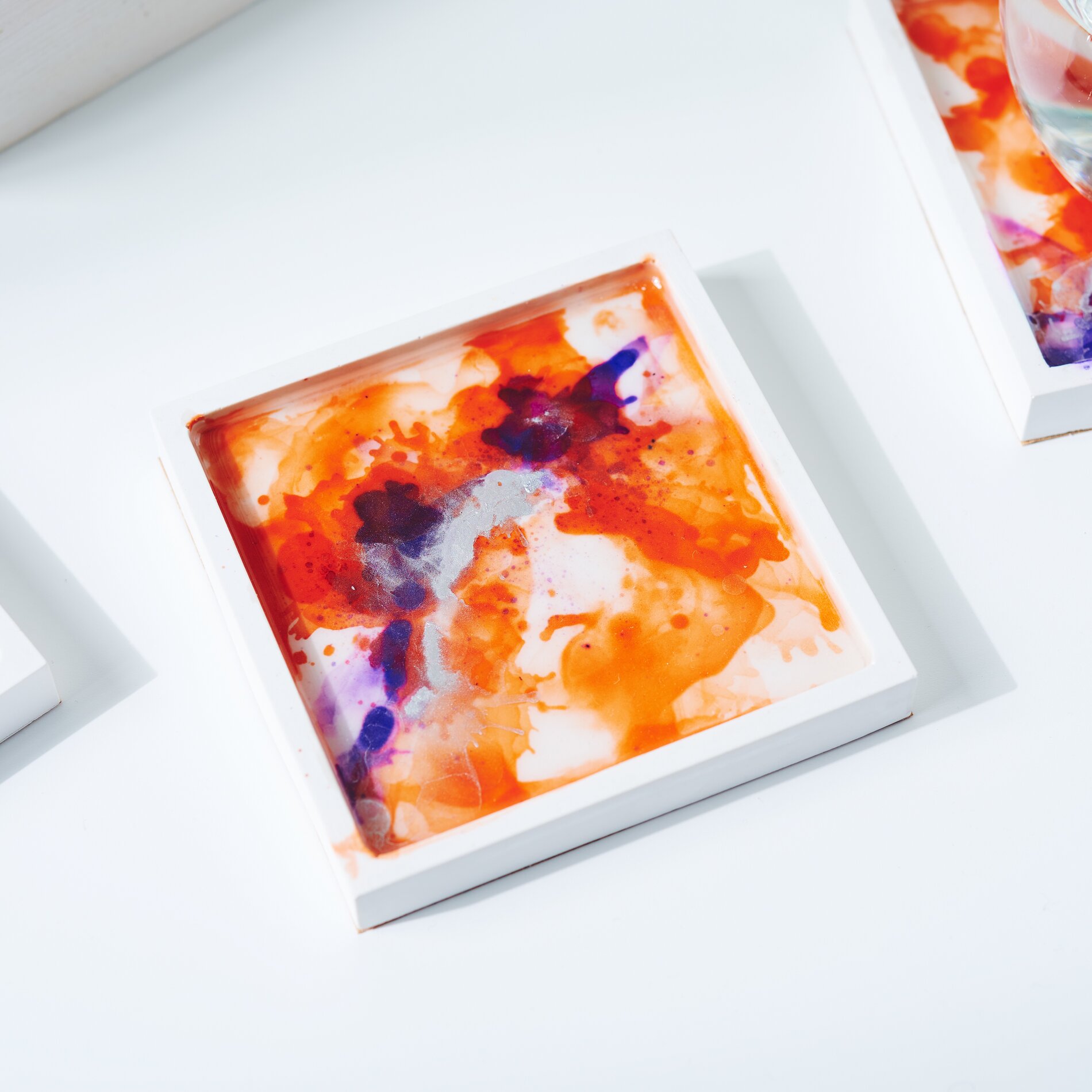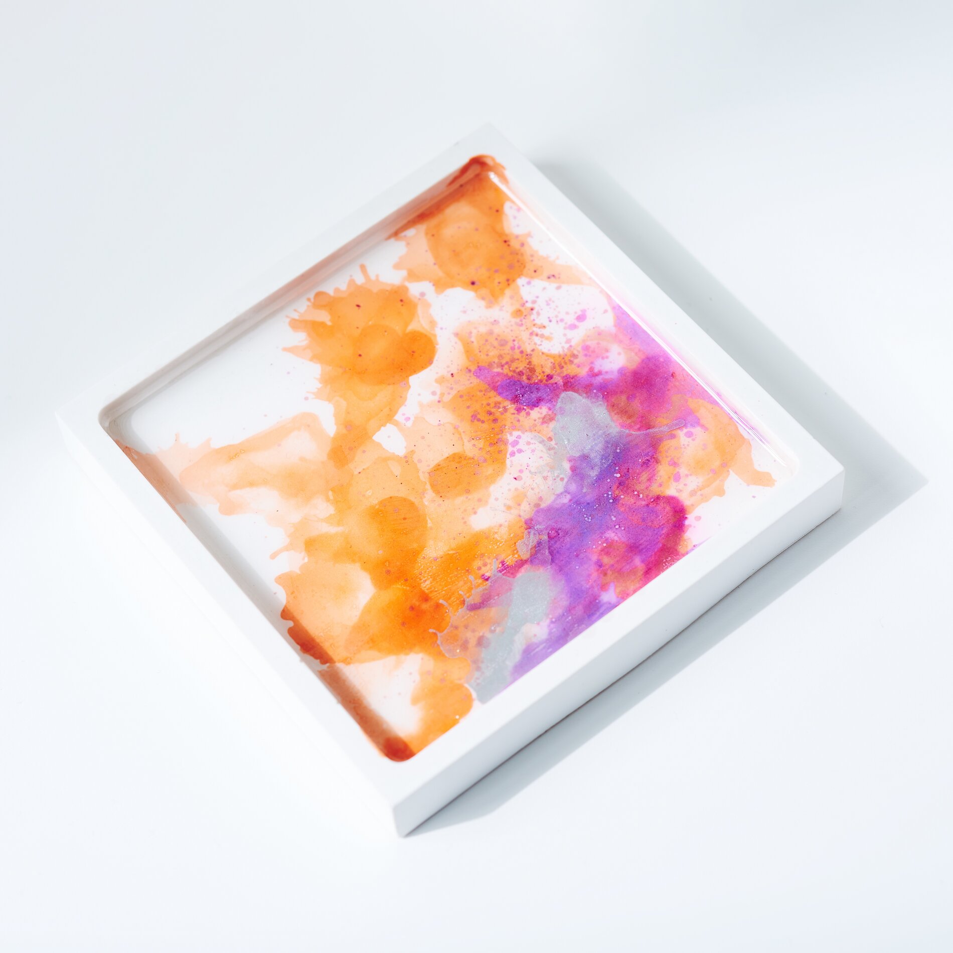 Alcohol ink: Alcohol ink is a technique based on highly pigmented alcohol-based inks. The inks dry within a few minutes as the alcohol evaporates quickly. The extender (pure alcohol) can be used to reactivate the dried inks. This allows the inks to be blended and diluted wonderfully into and with each other. This creates soft color transitions and abstract effects quickly and easily. Apply the inks to the Raysin coaster and smudge them with the bellows or a straw. You can use the extender before or after. If you want the ink to spread better or over a larger area, first apply a few drops of the extender to the coaster and then the ink over it. Simply experiment by creating different color gradients. Next, you can apply cold glaze to the inside of the coaster if you wish.