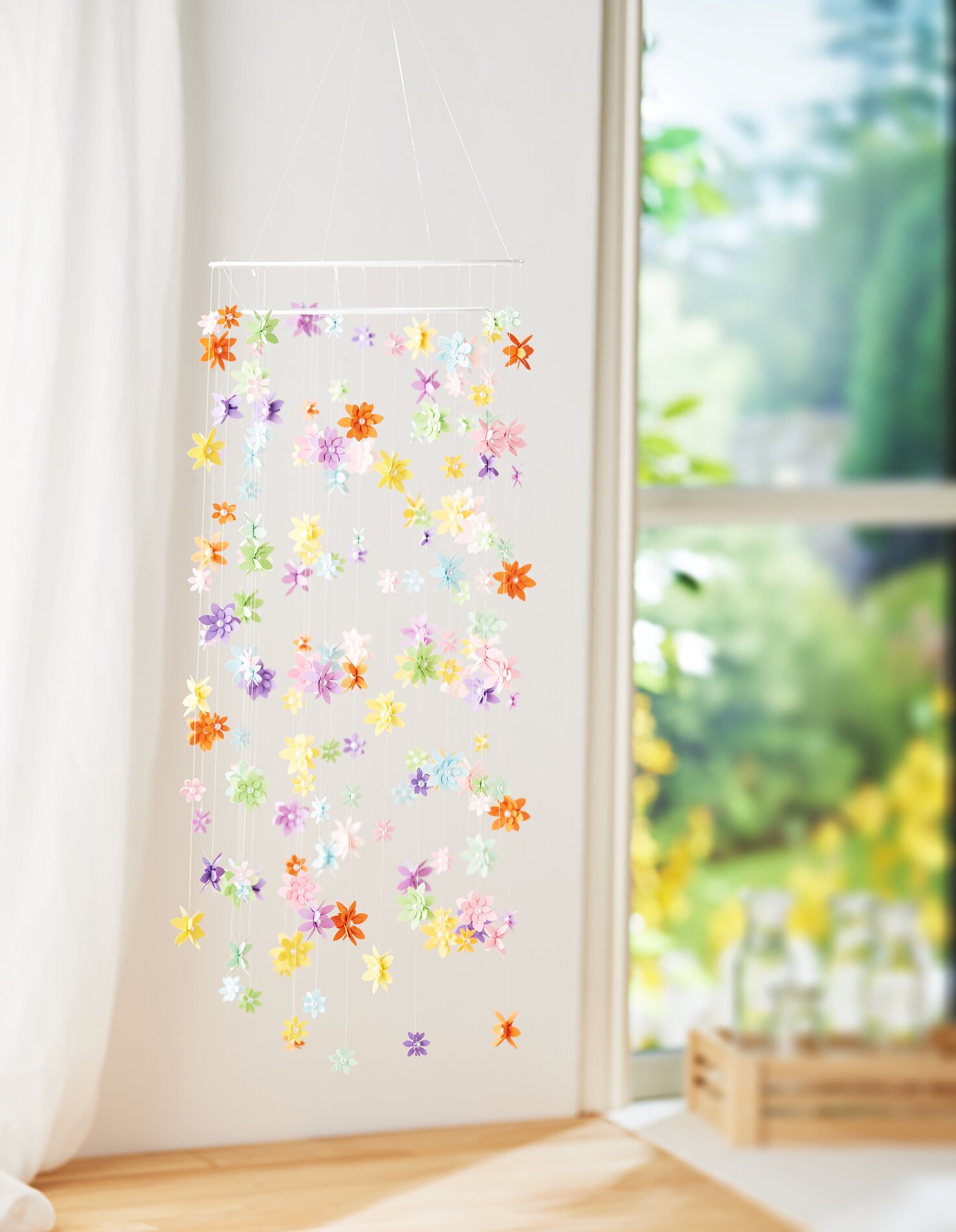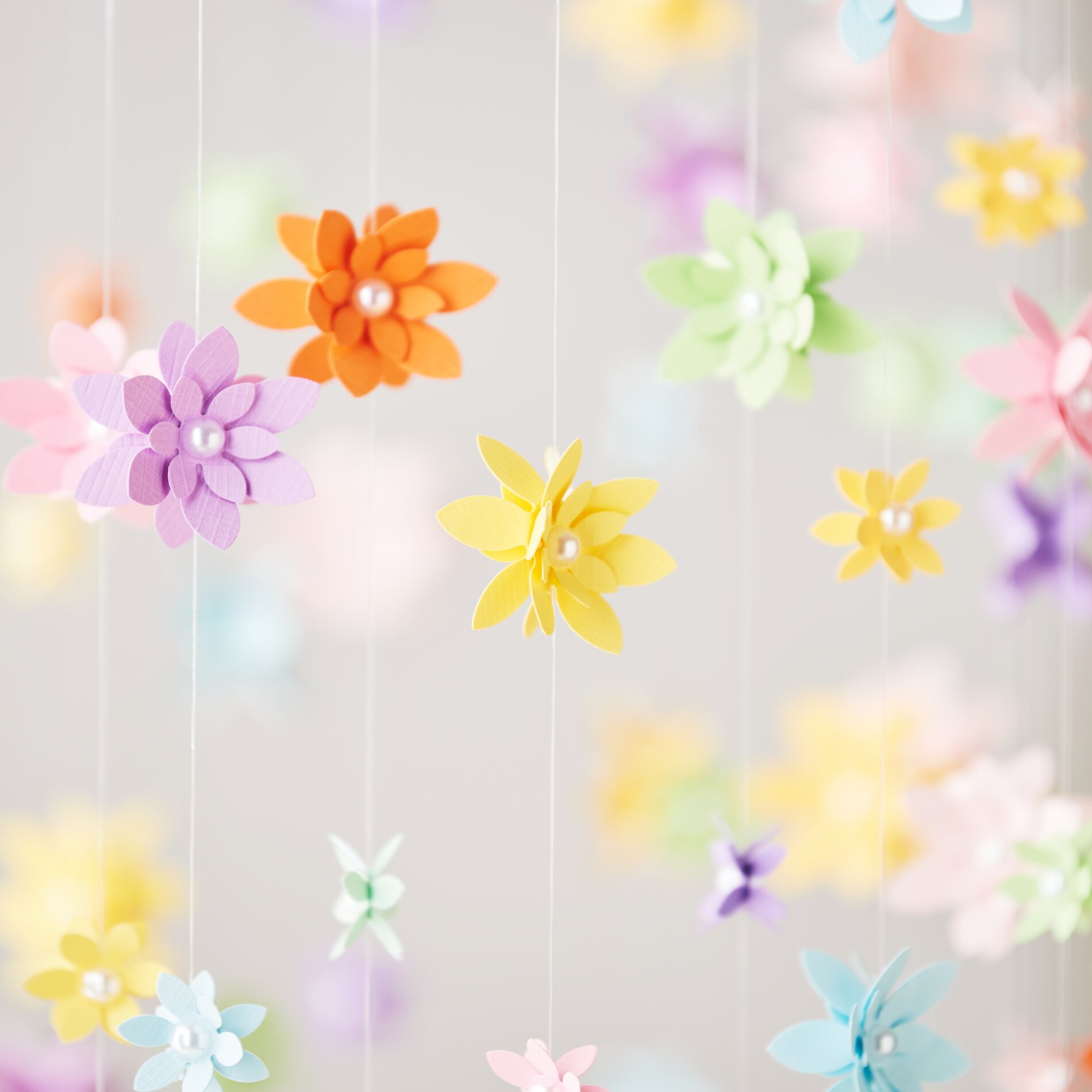 Your DIY Flower mobile is now ready to brighten up your home. Whether simple, colorful or playful - you can customize the design with colors, spacing and flower shapes.
