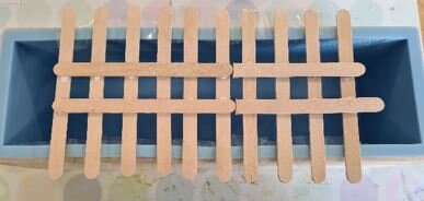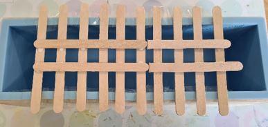 To prevent the test tubes from slipping when filling, you can make a small grid out of wooden sticks. To do this, place several wooden sticks vertically in front of you. These should be placed next to each other at the same distance if possible. Glue two wooden sticks horizontally to the vertical wooden sticks. This will create small squares into which the test tubes will fit.