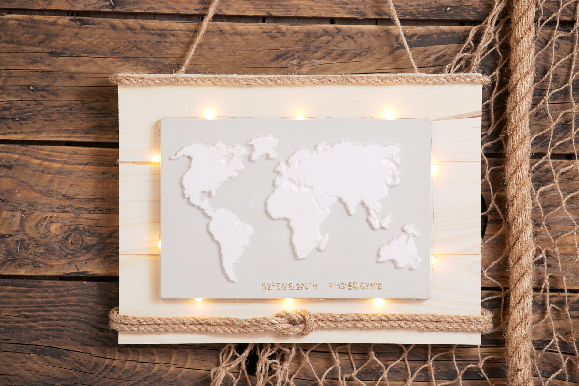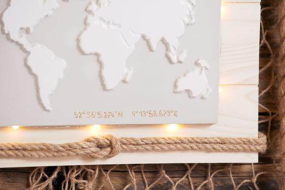 Decorate the decorative wooden panel with a sisal cord. Label the picture relief with the coordinates of your favourite place - both give your picture that special something.