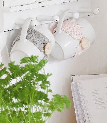 Decorate your cups with these beautiful borders of crocheted wool. The colours are adapted to the country house style and put the simple Coffee-cups immediately in scene. You can remove, change or wash the crocheted borders at any time. Crocheted from solid stitches you will get to these stylish cups in country house style in no time.