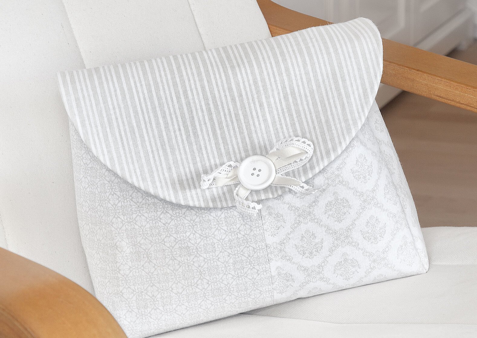 Plug the Stencil together. Sew the fabrics together according to your design wishes as shown in the picture. Press the seam allowances over. This gives your outer fabric. If you like, you can also use an appropriately large, single-coloured piece of fabric. Place the fabric layers on top of each other as follows: Outer fabric with the right side up Inner fabric with the right side down Volume fleece Stitch all layers together and turn them over. Place the Stencil and transfer the outline onto the fabric and cut roughly around the outline. Sew along the line and leave a turning opening on the side piece as shown in the illustration. Cut back the seam allowance in the turn opening to 1 cm and the rest to 0.5 cm. In the curve, snap the fabric with the scissors at a distance of 1 cm across the seam. Turn the sewing piece through the opening. Press the seams flat at low temperature and the seam allowance of the turning opening to the inside. To close the side seams, lay the edges of the outer fabric right sides together and sew the side seam. This will automatically close the turning opening. Turn your finished bag over and sew on a button for closing. At the top, cover the button with a lace bow and the Ribbon of the fabric package, sewing it on with a decorative button.