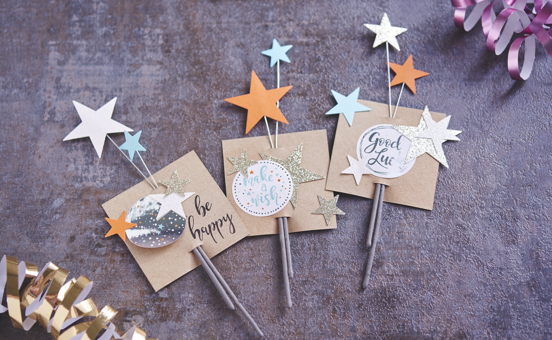Insert two sparklers per card with the handles facing up and stick stars on the top wire. With a Fineliners you can finally label the cards.