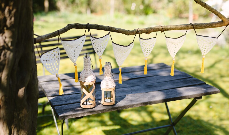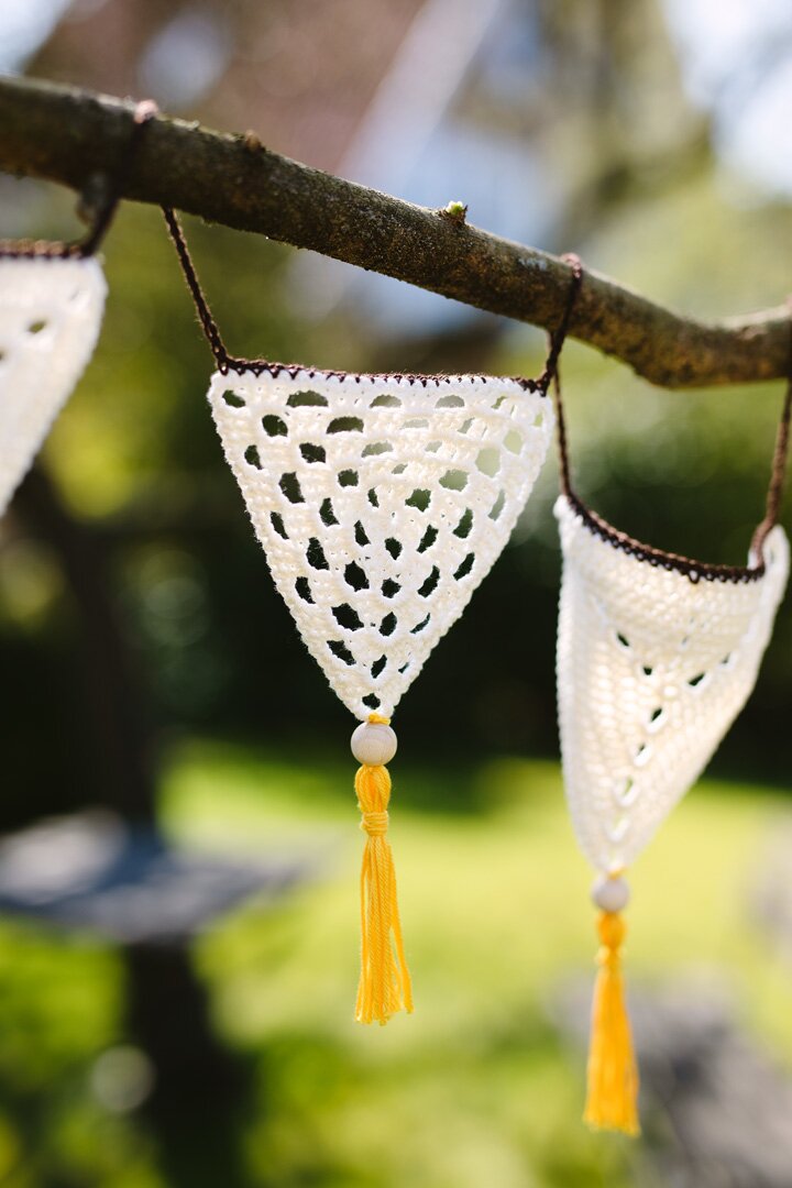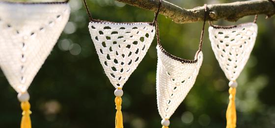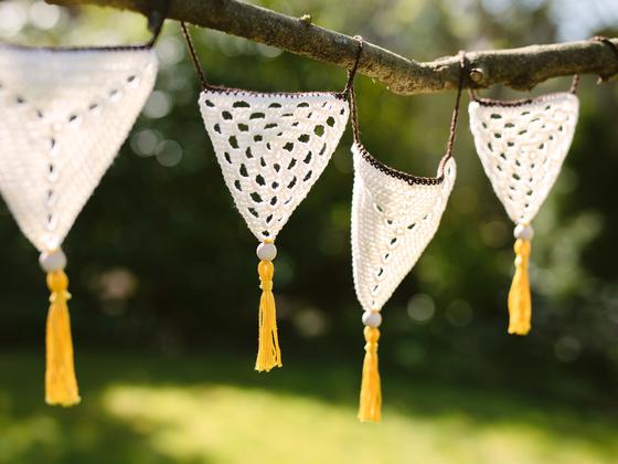 Alternatively, to make a tassel, simply wind a strand of yarn about 30cm long around a piece of cardboard 7cm wide. Tie this strand together on one side with another thread and cut the tassel at the opposite end. Wrap another strand of yarn around the knot for that signature "tassel" look. Knot a strung wooden bead to the tassel head and pennant.