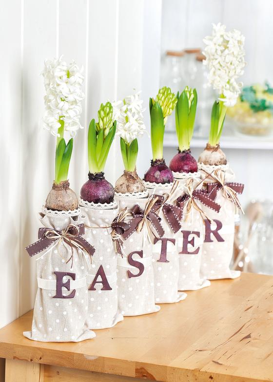 Create pretty glass bottles in country house design. The bottle set is sewn with fabric and lovingly decorated with accessories like Lace ribbon and bow. The glued-on letters make the bottles a real eye-catcher for the Easter season.