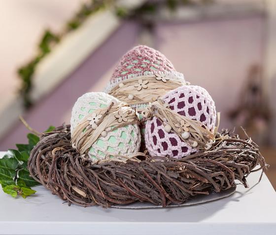 Whether individually as a gift or in a group in the Easter nest, these large eggs with their crocheted shell are an Easter decoration with nostalgic charm