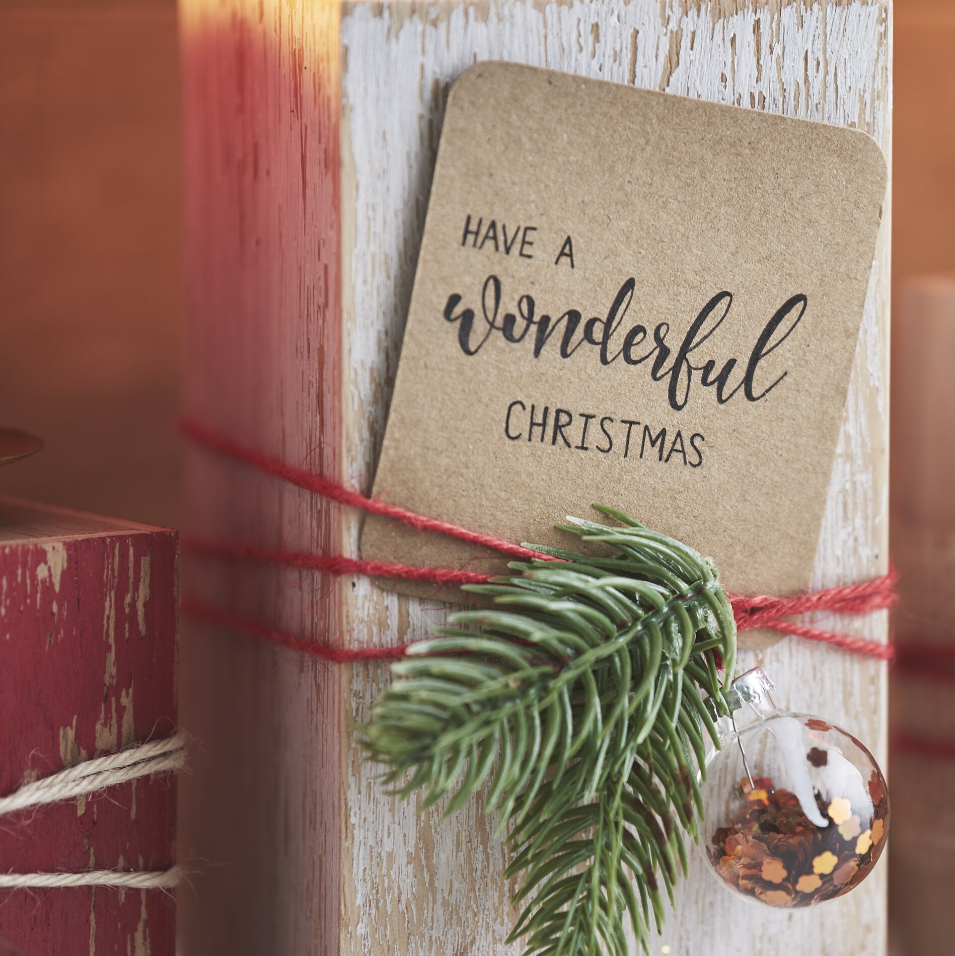 On a cut Kraft paper Label, the writing "Have a wonderful Christmas" was written with handlettering. The label was simply inserted between the attached jute cord and thus fastened.