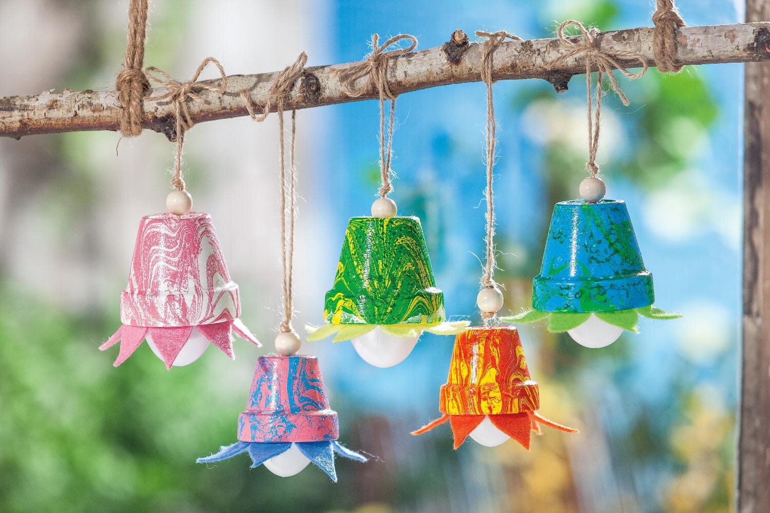 Thread one wooden bead at a time on a string, put it from the inside through the hole of a pot, put both ends of the string through another ball, make a knot and use the string later as a suspension
