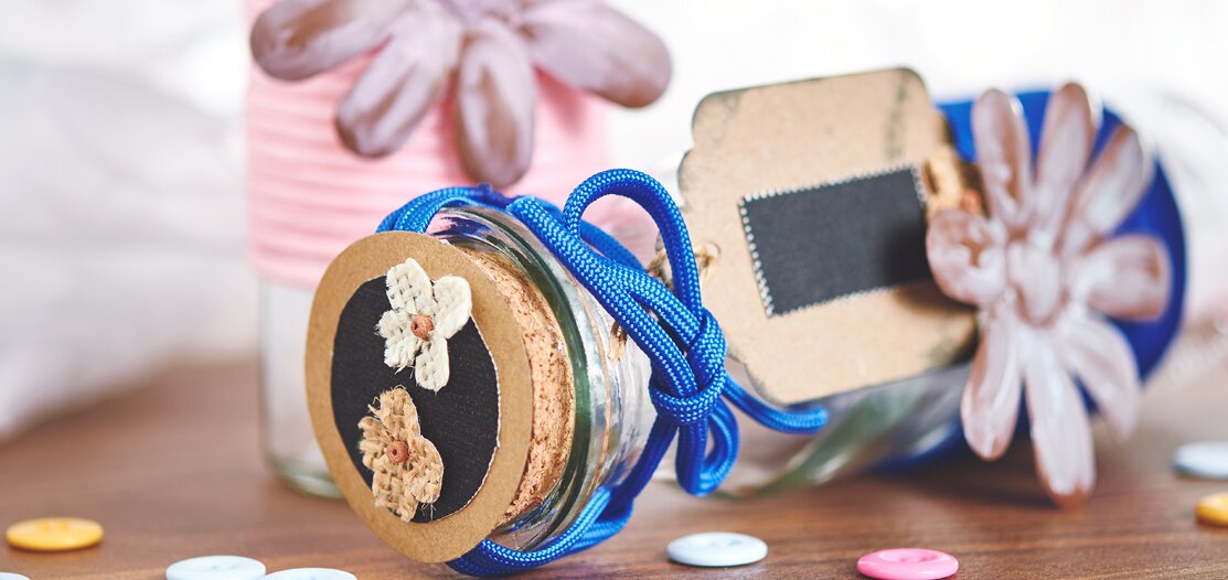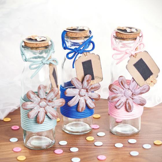Tie the labels to a Paracord ribbon, stick the decorative tape with hot glue between the decorations and the cork of the bottle. Once the bottles are filled, the lid can be put on together with the label.