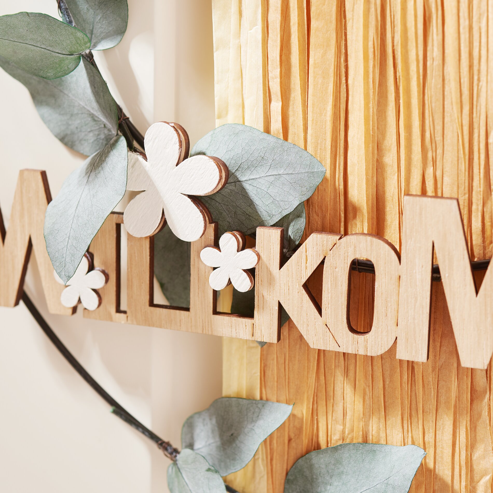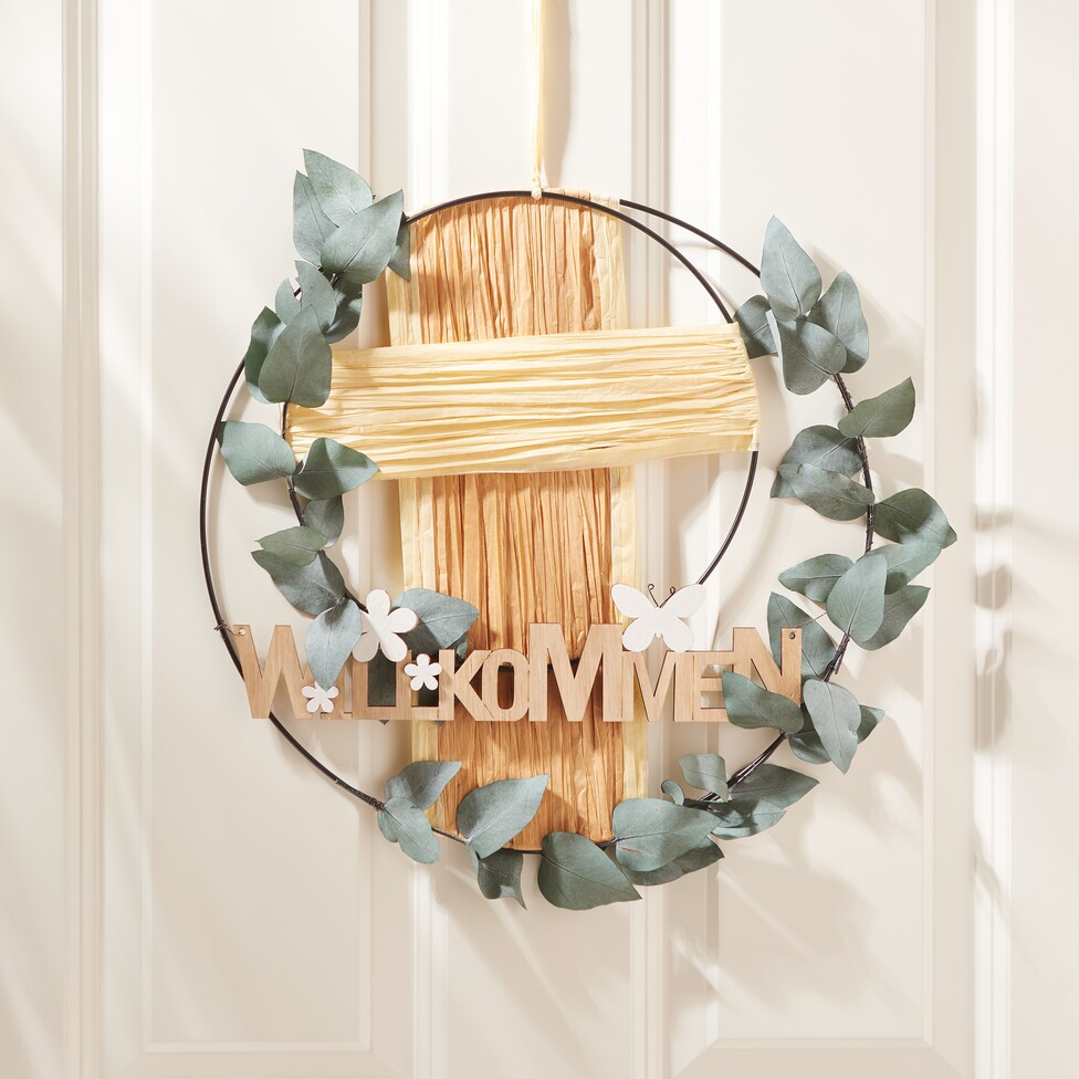 Place the "Welcome" lettering on the rings and secure it with wire. This way, it is well secured in the right place in the decoration.