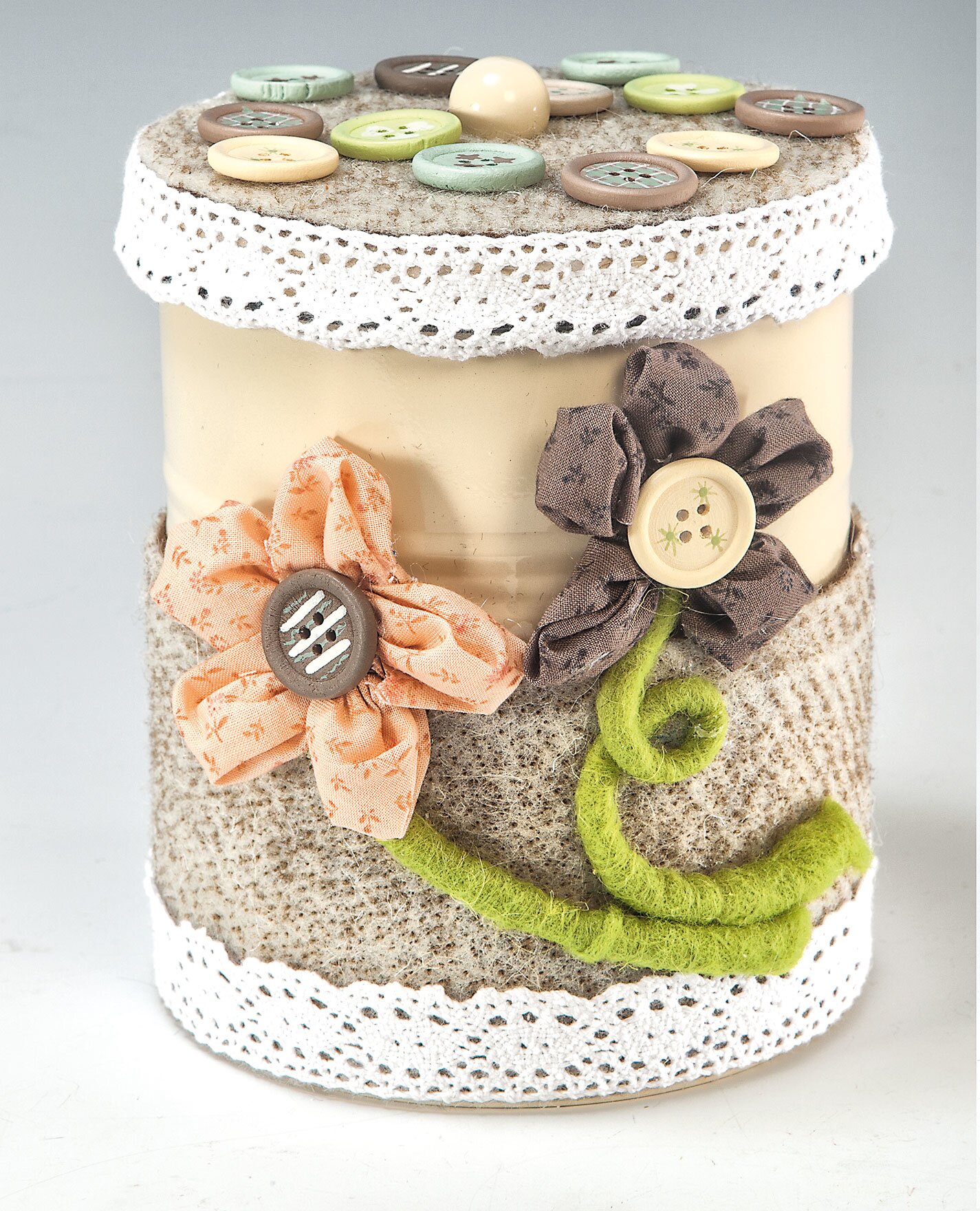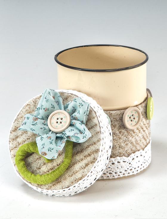 These instructions are ideal for the "upcycling" of old metal cans. The practical, cream-coloured metal cans used in the idea get a dress made of Felt ribbon and lace. The pretty wooden buttons cut a very good figure solo and in the self-sewn fabric flowers.