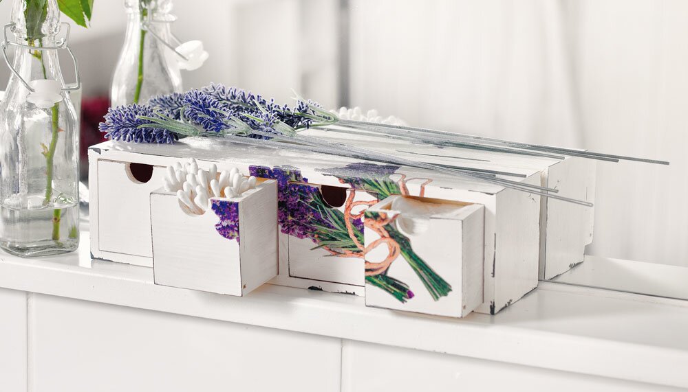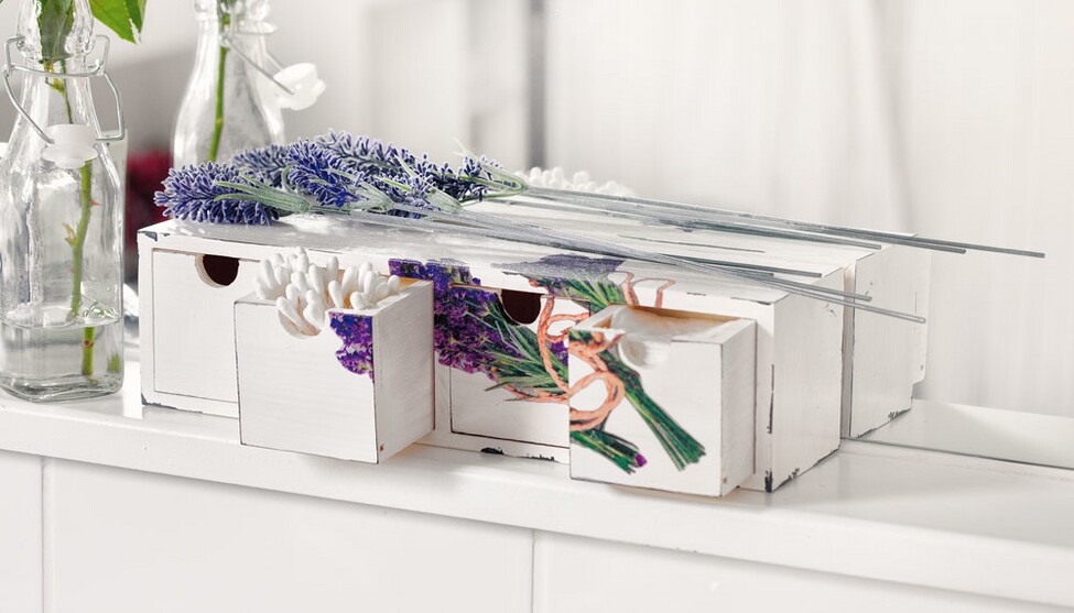 Prime all parts of the shelf in white and let them dry. Cut out the Napkins-motifs and stick them on with Napkin varnish . When the Napkin varnish is well dried, carefully cut out the drawers and openings with a scalpel. Finally, accentuate the edges with the black paint by simply stroking roughly along the edges with a brush.