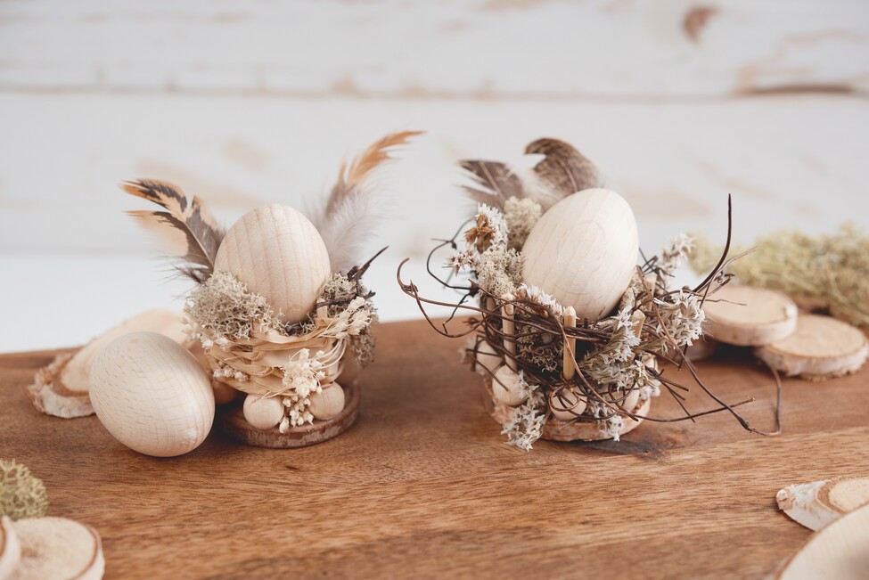 Next, when everything has dried, you can start to wrap or weave the skewers with natural bast or VBS decorative willow. Then you can fill the nest with moss and an egg.